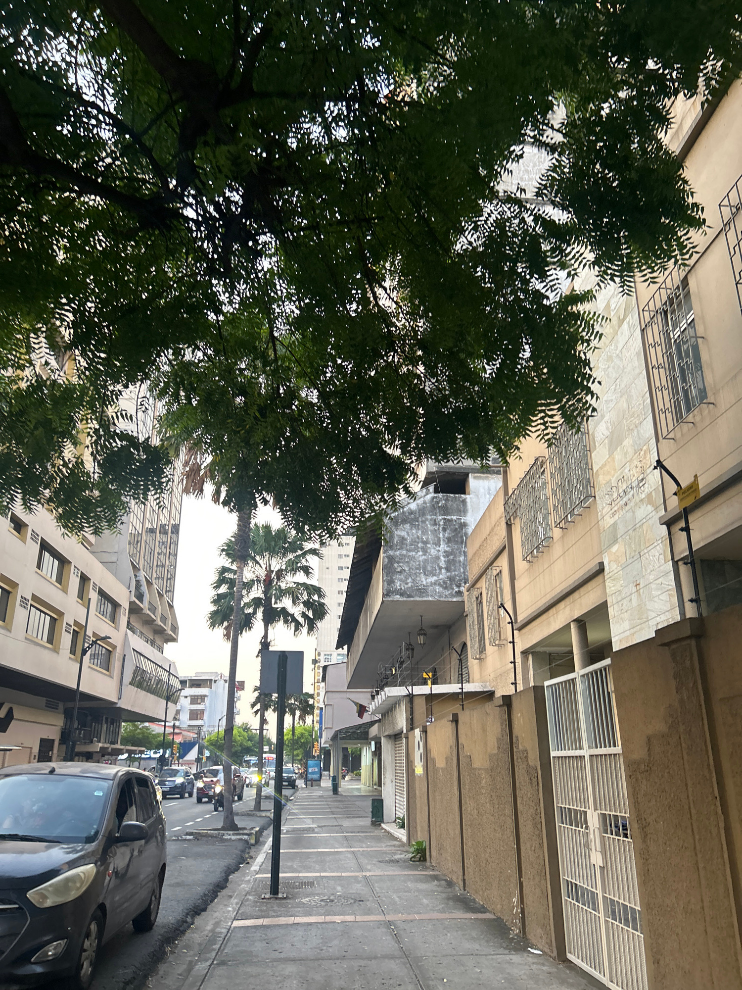 A street view in Guayaquil, Ecuador, captured on a clear day. A dark gray car is parked on the right side of the street, with its front end facing the viewer. A sidewalk runs along the right, adjacent…read more