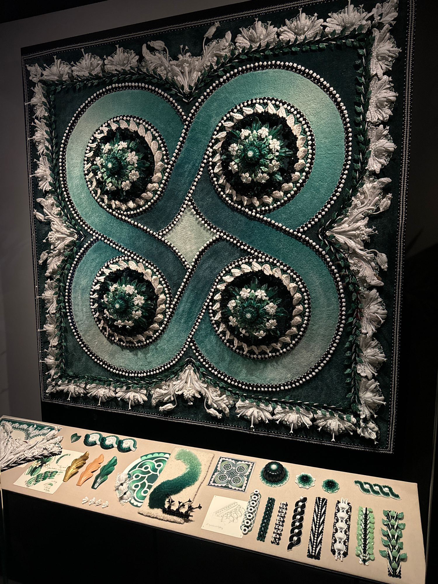 The image shows a display of textile art, likely located in an art gallery or museum. The primary subject is a square textile artwork with a complex design featuring a symmetrical, swirling pattern in…read more