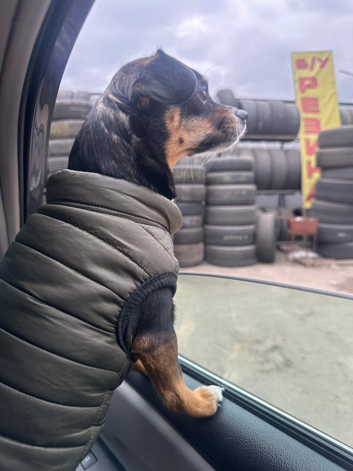 A medium shot shows a brown and black dog wearing a quilted, olive-green vest, with its head and front paw extended out of a car window. The dog is looking upward. Stacks of tires and a sign with lett…read more