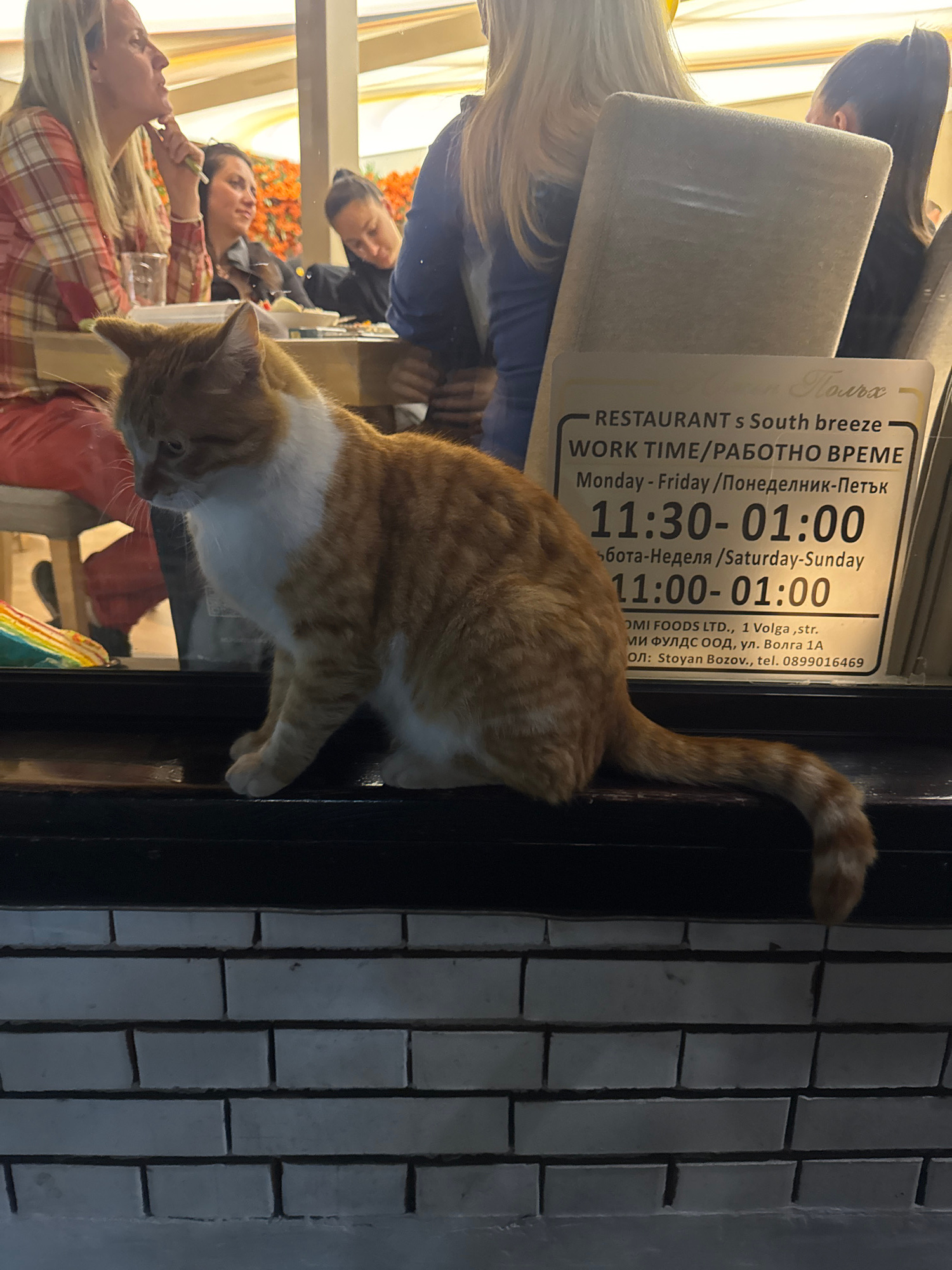 An orange and white cat is perched on the edge of a window or door frame. The window provides a view into a restaurant with patrons, including at least one person eating. A sign on the glass indicatesβ¦read more