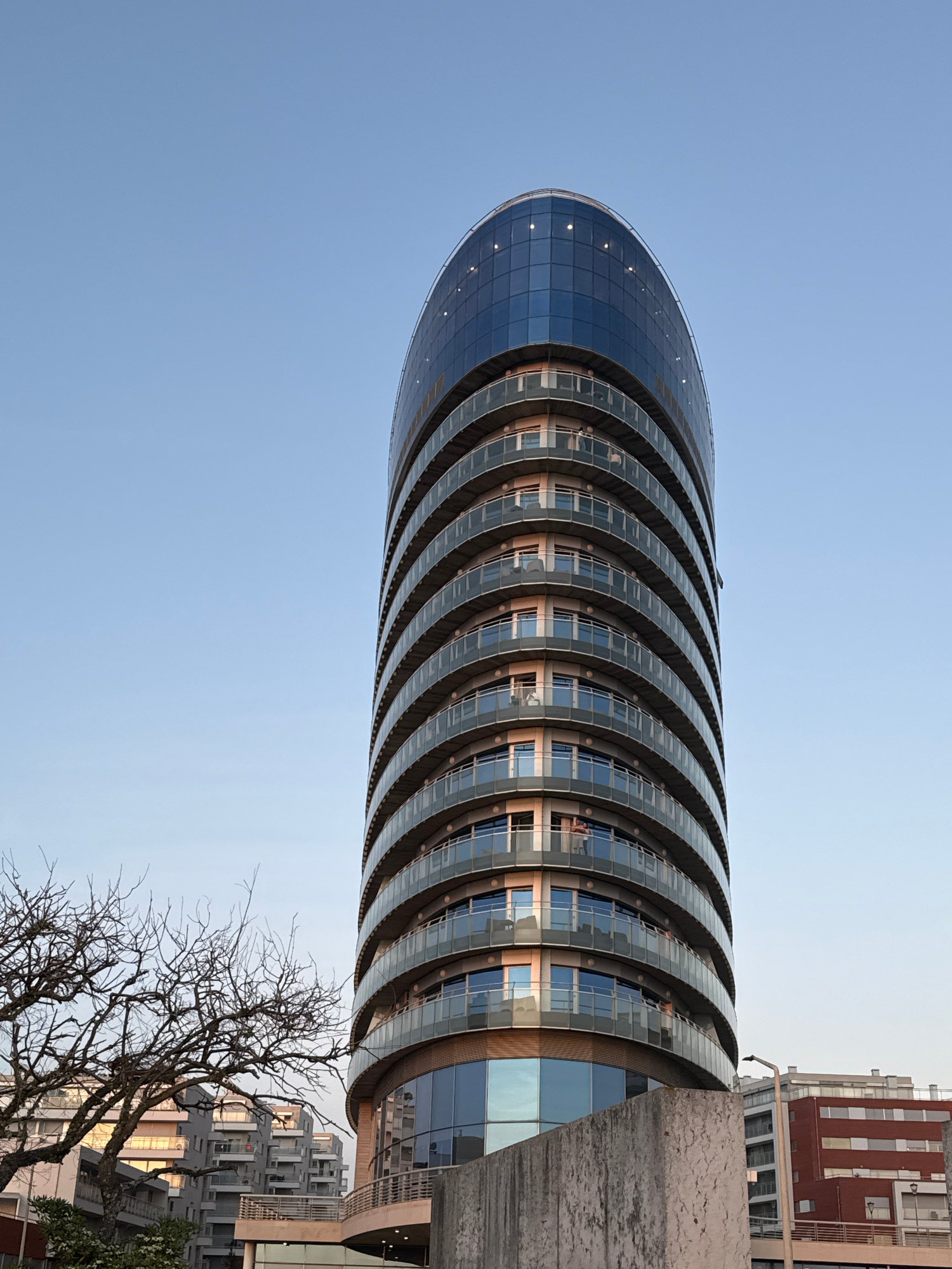 The image depicts a cylindrical, multi-story building with rounded ends. The building's façade is made of glass and has a layered, terraced design with what appear to be balconies encircling each leve…read more