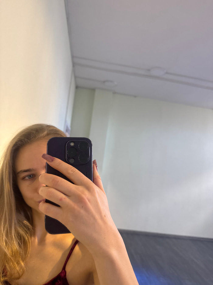 The image depicts a mirror selfie of a female individual taken indoors. The woman, with blonde hair and light-colored eyes, is visible from the mid-chest upward. She is wearing a dark red or burgundy…read more