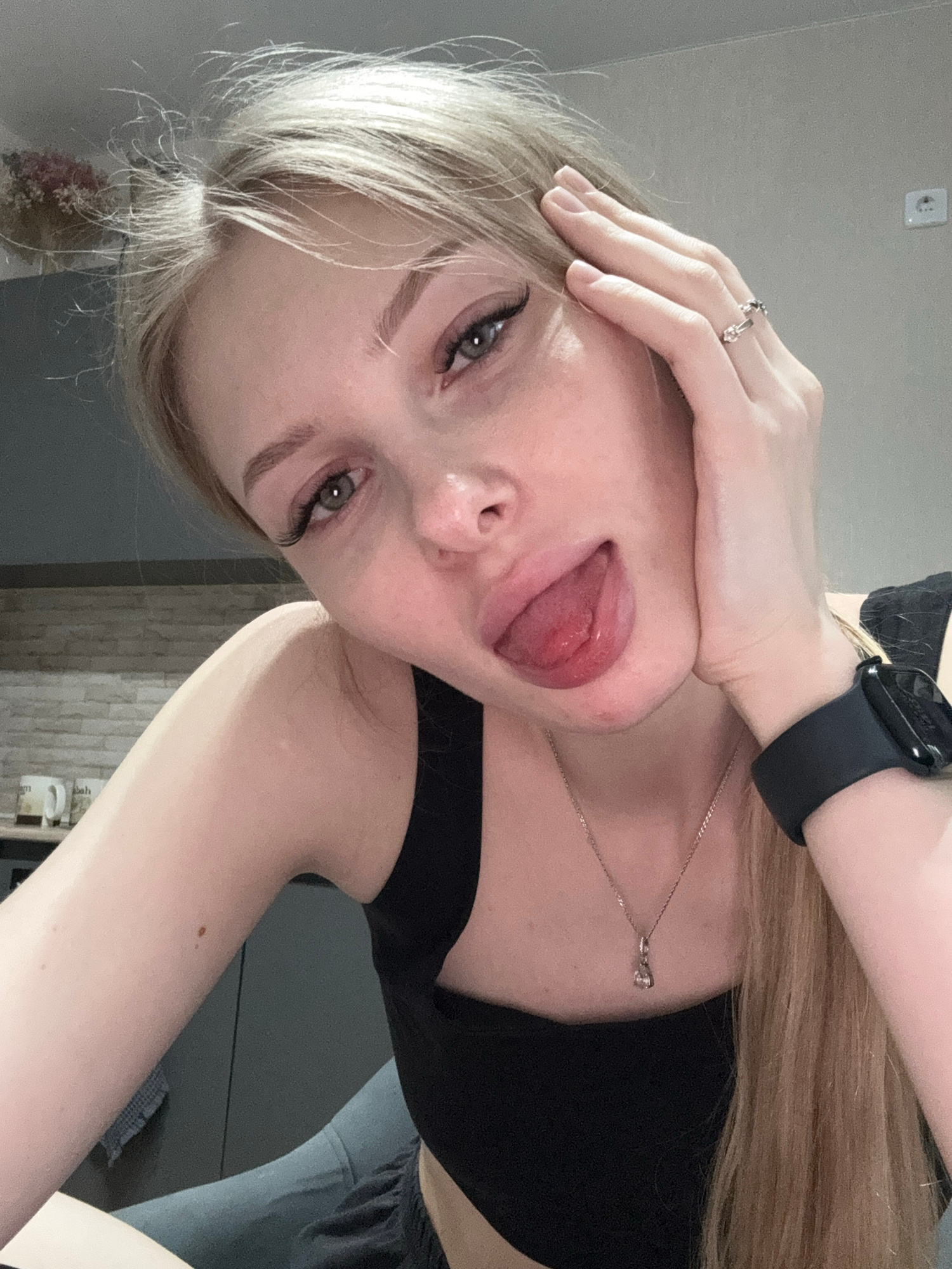 A light-skinned woman with blonde hair is seen at close range in a photograph oriented at an angle. The woman is wearing a black top, a silver necklace, and a black smartwatch. Her right hand is raise…read more