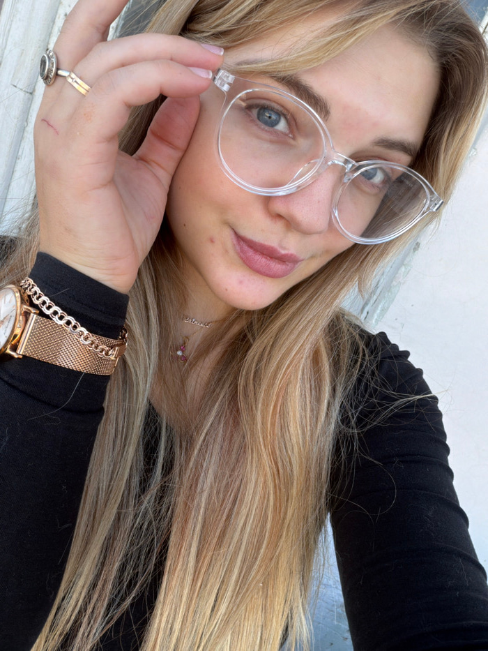 A close-up, chest-up photograph displays a female individual with long, light blonde hair and blue eyes, situated in Naberezhnye Chelny, Russia. She wears clear-framed, round-ish eyeglasses, which she…read more