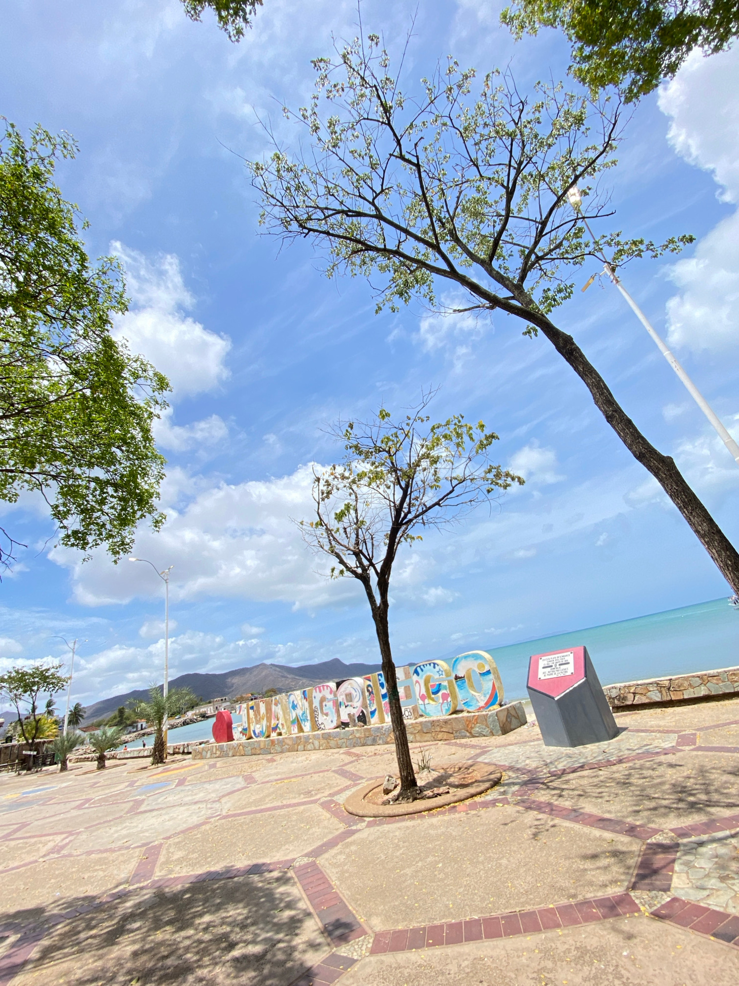 The image shows a sunny day scene at Juan Griego, Venezuela. The foreground features a patterned stone walkway extending into the distance. A tree grows directly from the walkway, interrupting the pav…read more