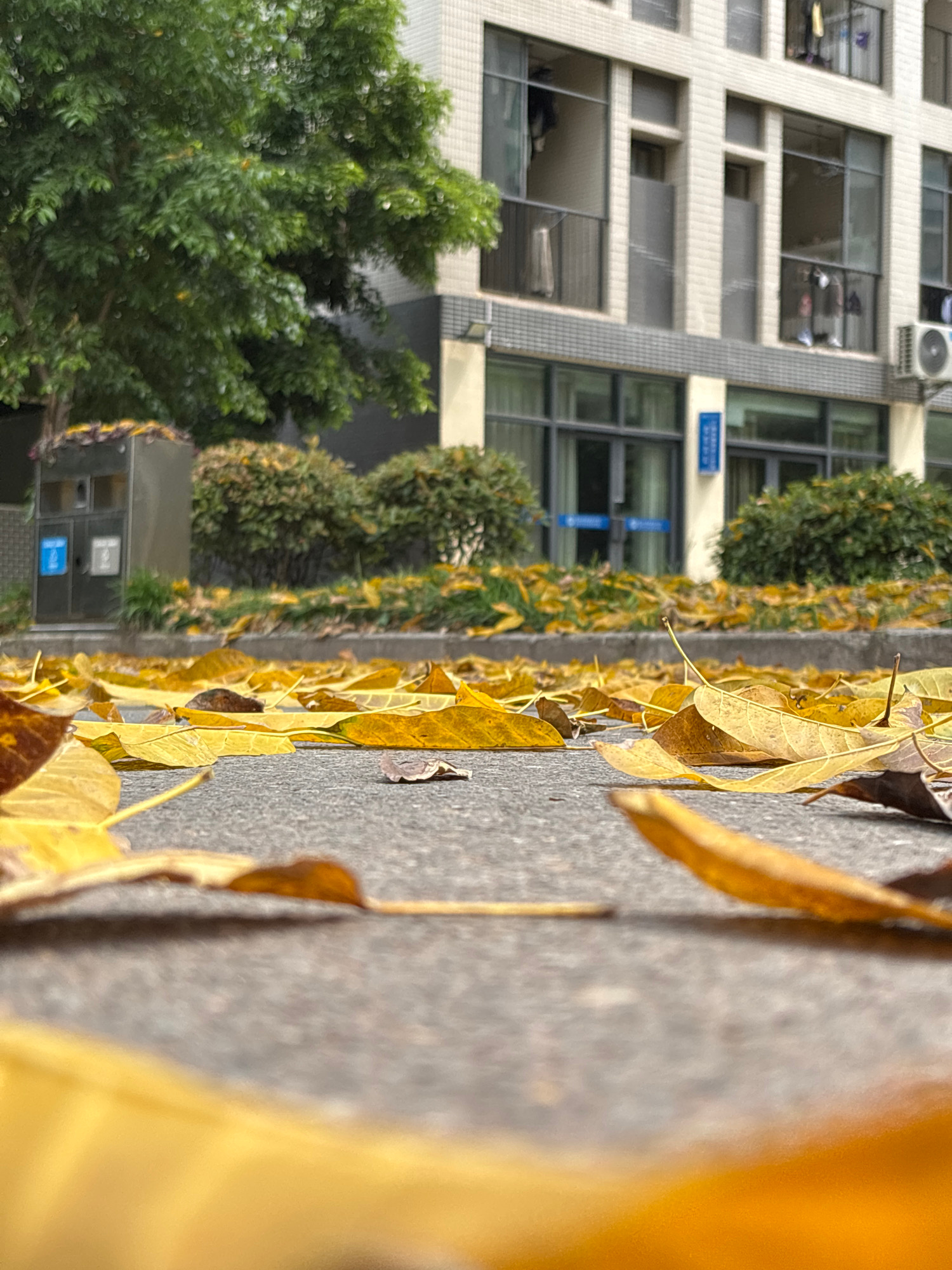 The image depicts a sidewalk in Jiangjin, China, littered with fallen yellow leaves. The sidewalk is adjacent to a building with multiple floors and windows. Green trees and bushes line the sidewalk,…read more