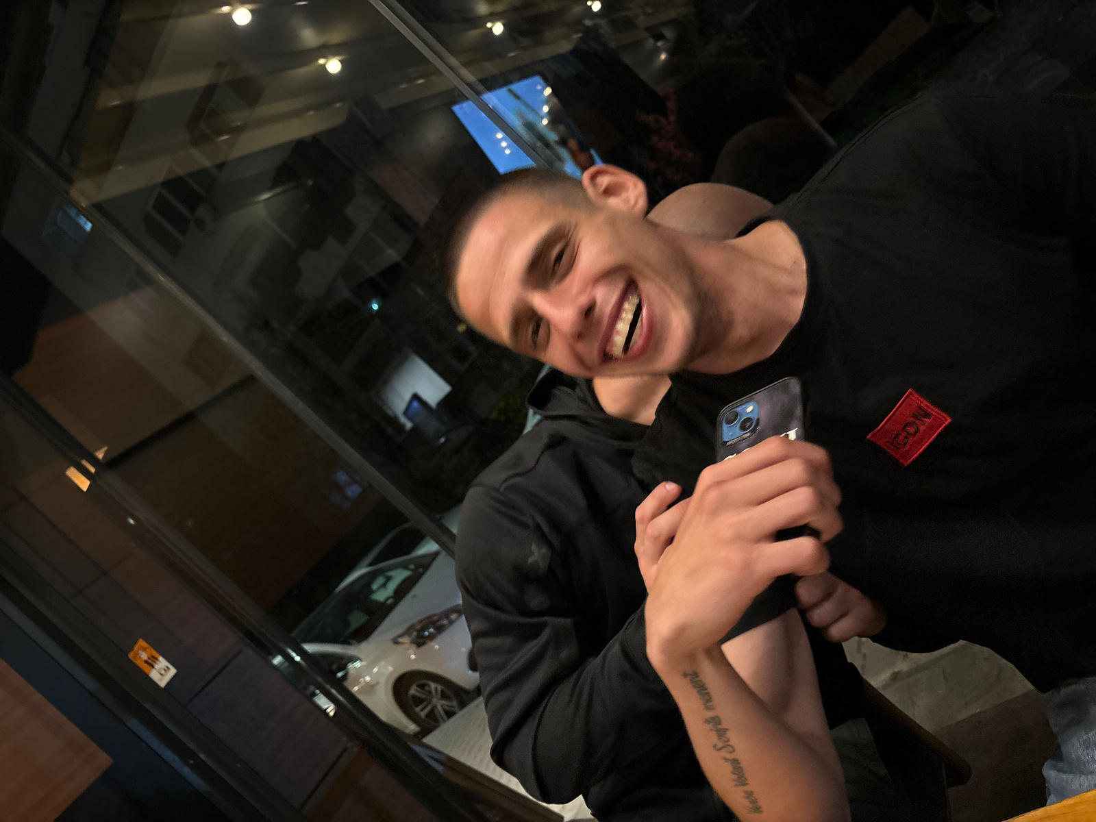 A close-up, candid shot depicts a man with a shaved head, laughing and holding a smartphone. He's wearing a black shirt with a red "ICON" patch. Another individual, wearing a black hoodie, is partiall…read more