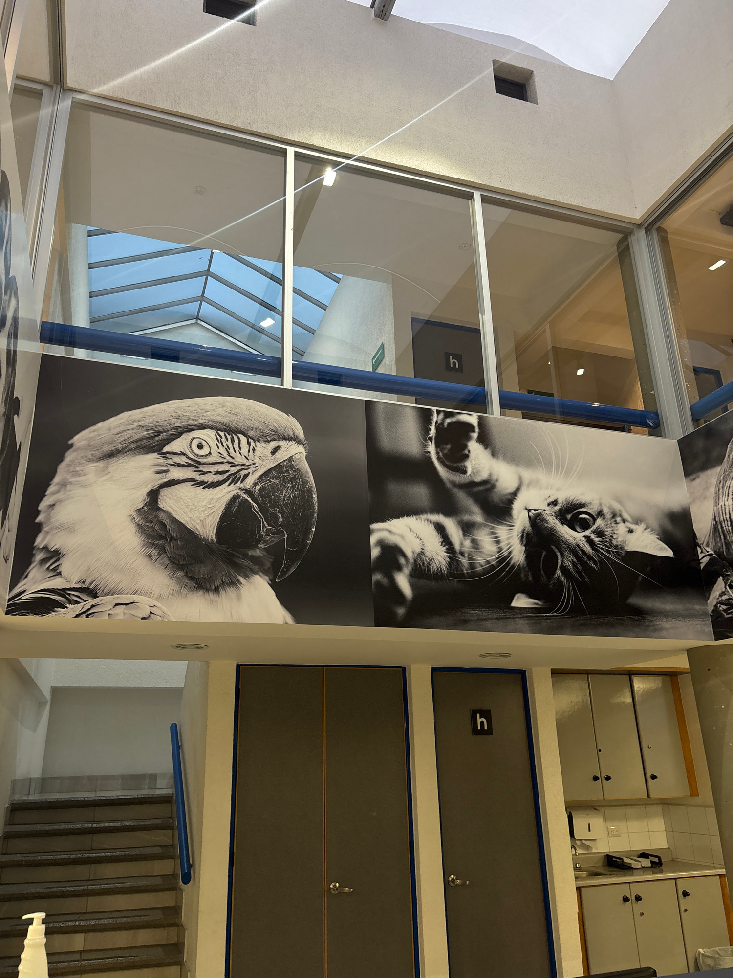 This indoor scene in Puebla, Mexico, presents a large, vertically oriented monochrome print featuring a cat above a macaw. The print is mounted on a wall near a glass-walled area with an angular archi…read more