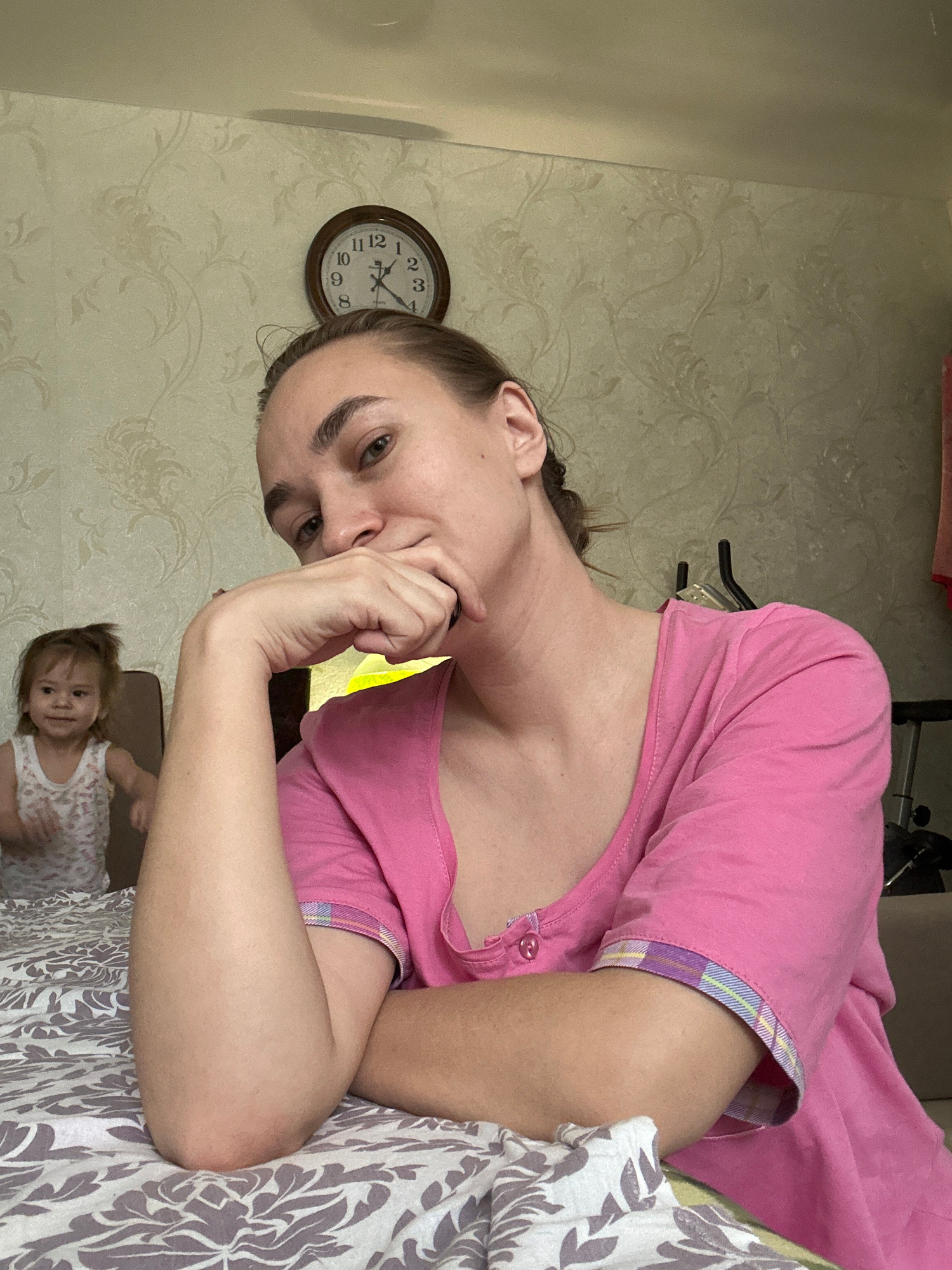 A woman is reclining on a bed covered with a grey and white floral patterned comforter. She is wearing a pink top with a plaid cuff detail. Her face is turned toward the camera with her hand near her…read more