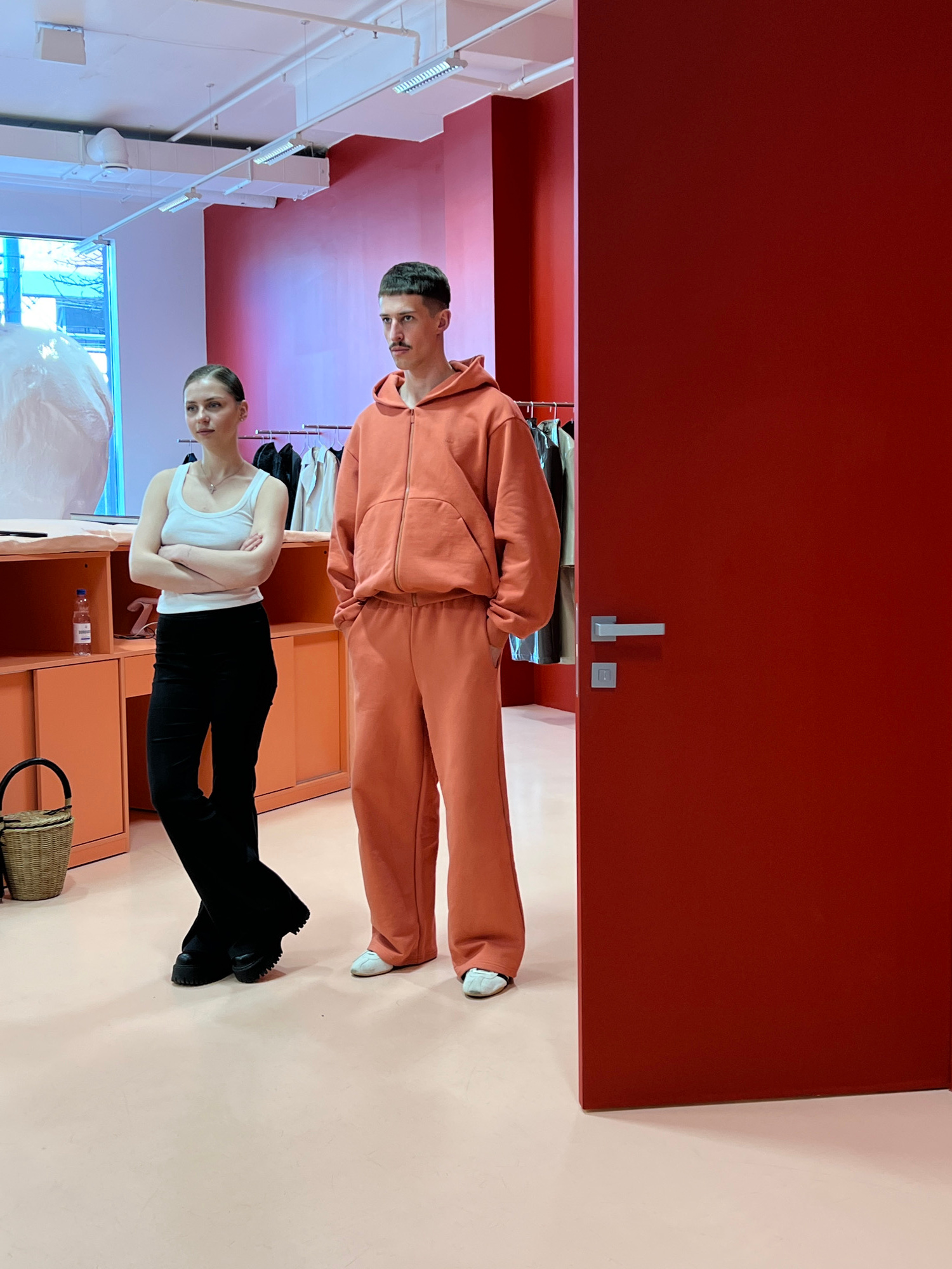 Two people are in a retail space. A person wearing a pink-orange tracksuit stands facing forward. Another person is wearing a white top and black pants. A variety of clothing, a water bottle, and a ba…read more
