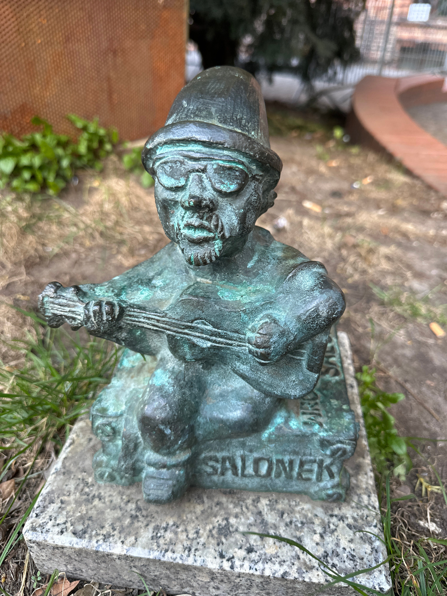 The image shows a bronze sculpture of a dwarf playing a cello, located in Wrocław, Poland. The dwarf is wearing a hat and seated on a stone block that has the name "SALONEK" inscribed on the side. The…read more