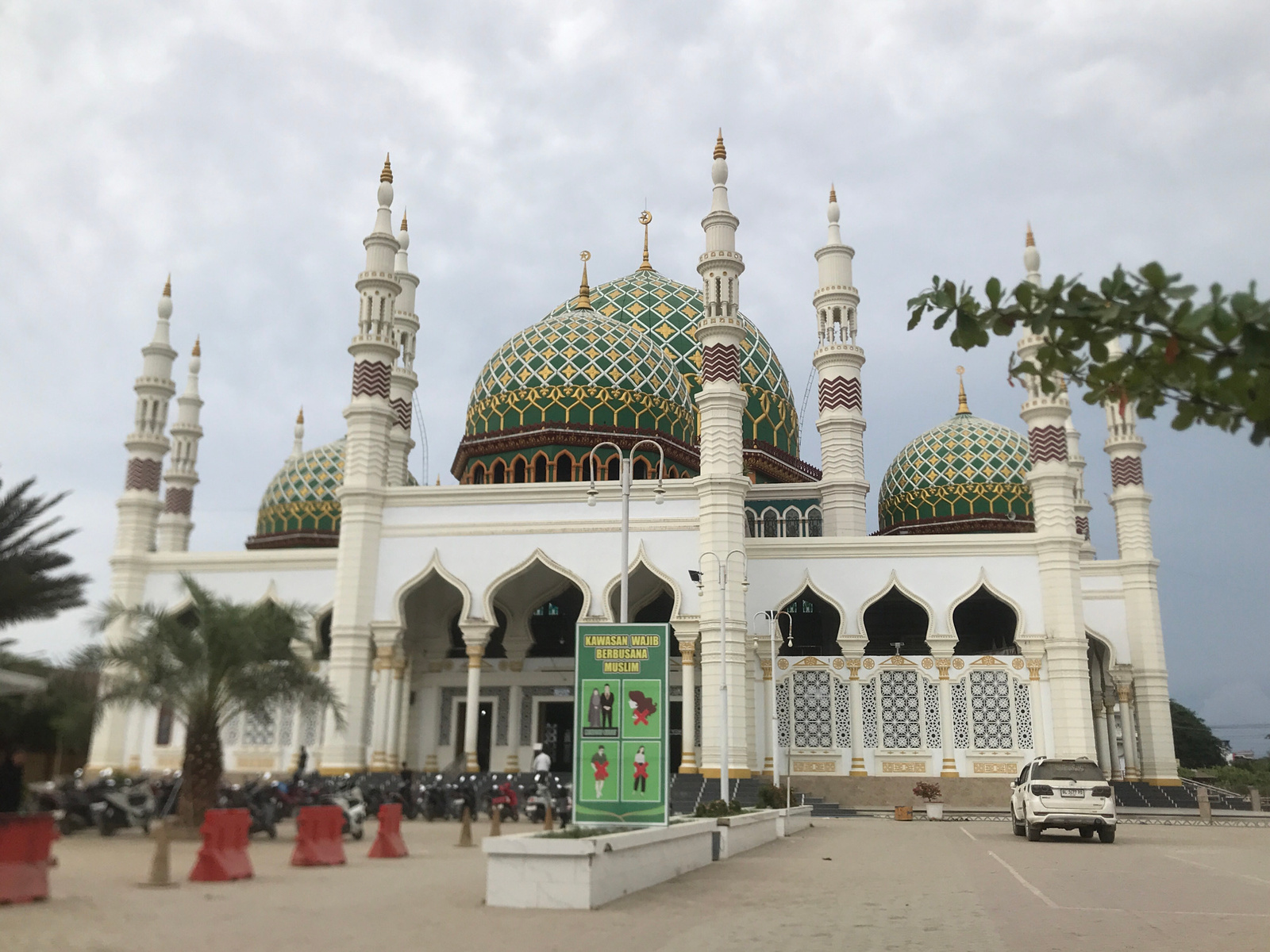 The image depicts a mosque, specifically Masjid Islamic Center Lhokseumawe, located in Kotapantonlabu, Indonesia. The mosque is predominantly white with green and gold patterned domes and several mina…read more