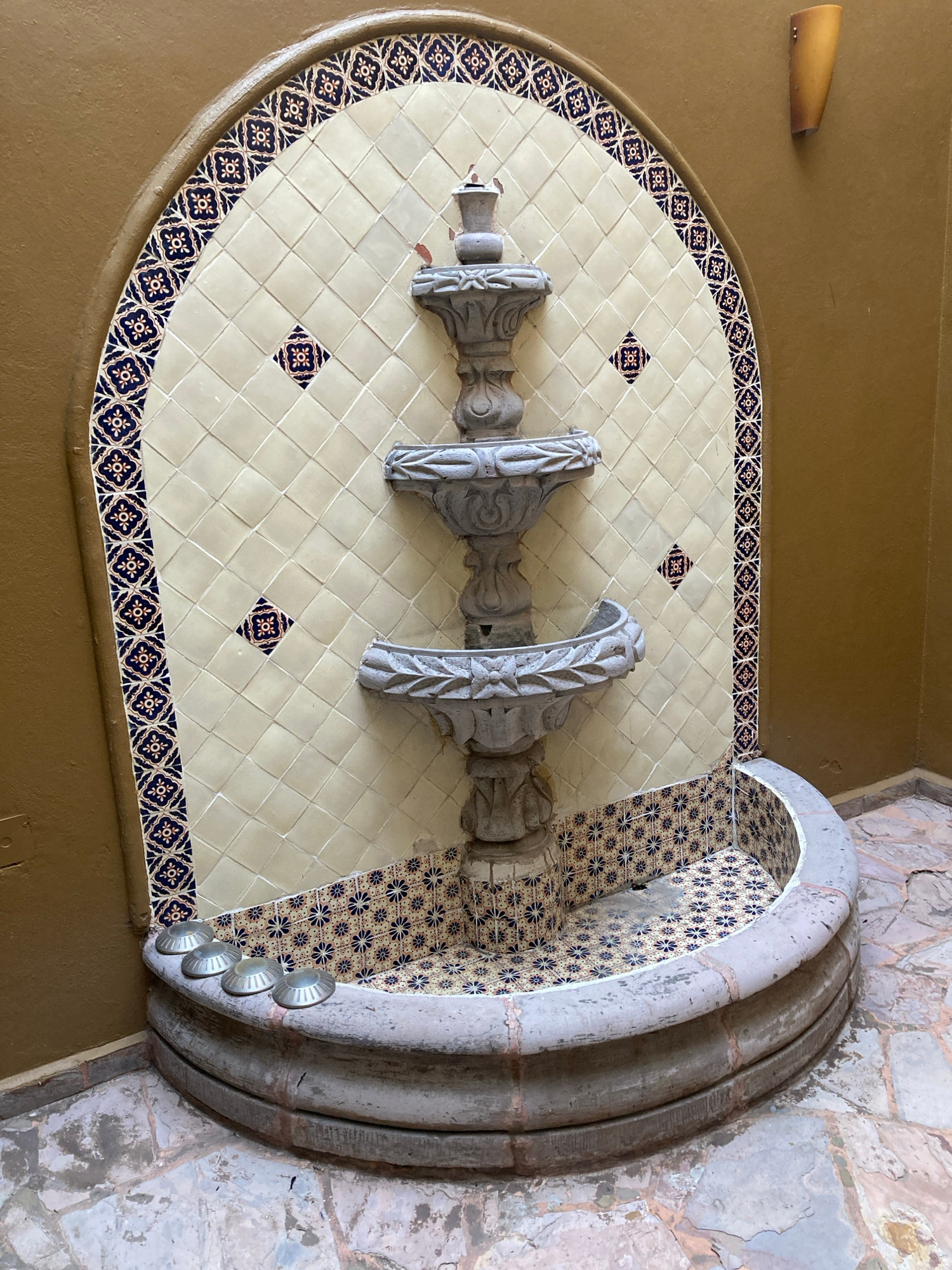 Here is a detailed description of the image: **Location:** The image depicts a decorative water fountain, likely situated in a building or courtyard setting in Tres de Mayo, Mexico. **Environment:**…read more