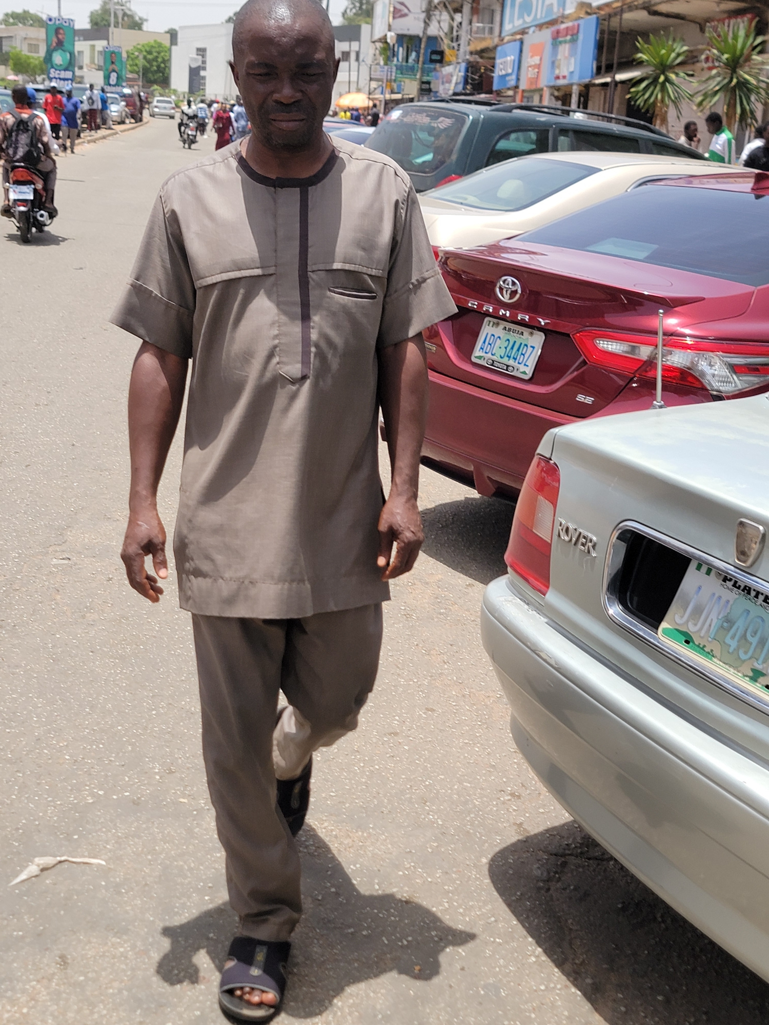 A man in a brown shirt and pants stands on a street. The background includes a red Toyota Camry with a license plate that reads "ABC-344BZ" and a white Rover with the license plate "JJN-49." The stree…read more