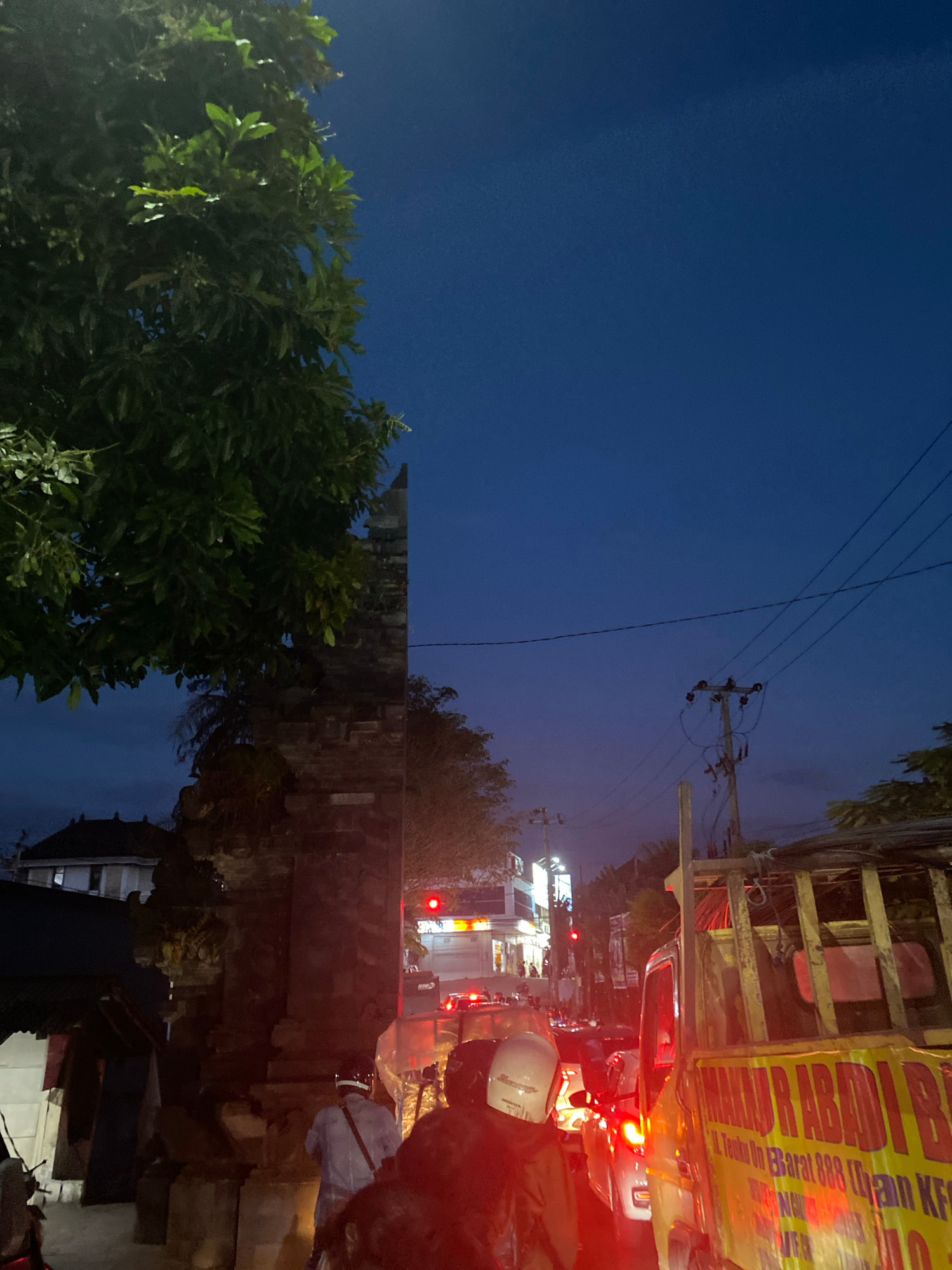 The image captures a street scene at night in North Kuta, Indonesia. The sky is a deep blue, suggesting dusk or early evening. The perspective is slightly tilted. On the right side of the image, ther…read more