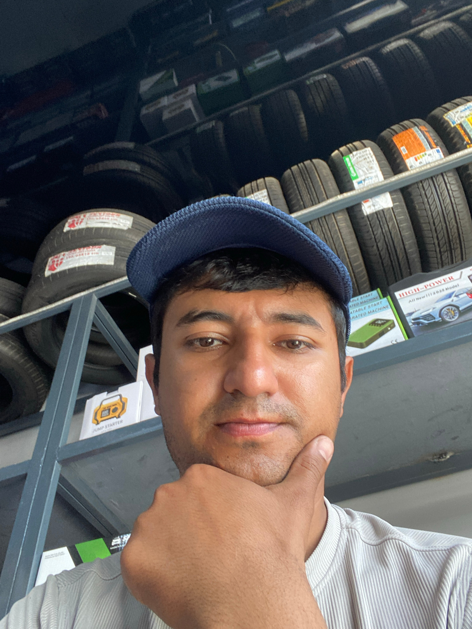 A man with dark hair, brown eyes, and tanned skin, wearing a blue baseball cap and a light gray striped shirt, poses for a self-facing photograph inside a tire shop. He rests his right hand under his…read more