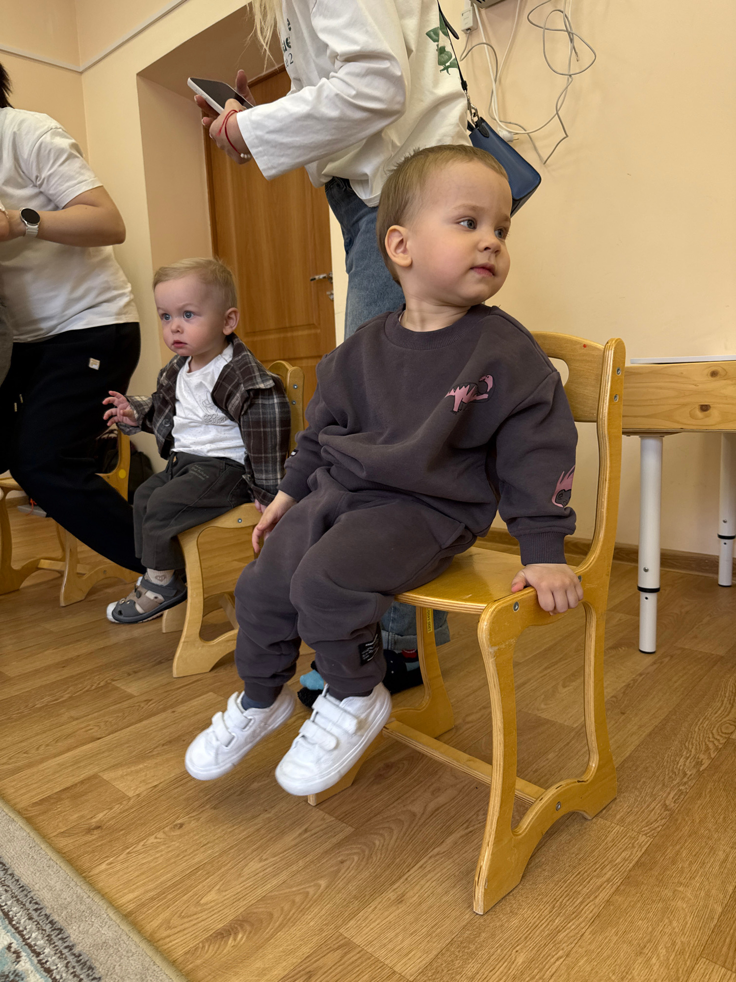 A candid, indoor photograph depicts two young children sitting on a wooden structure, likely a piece of play equipment or furniture. The child at the top is wearing a purple-grey sweatsuit with whiteβ¦read more
