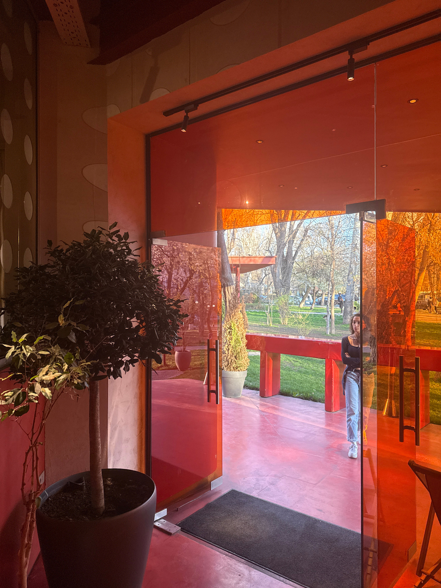 The image shows a view from inside a building looking outward toward a park, likely taken in Yerevan, Armenia. A woman with dark hair stands in the doorway or transition space, reflected in the glass…read more