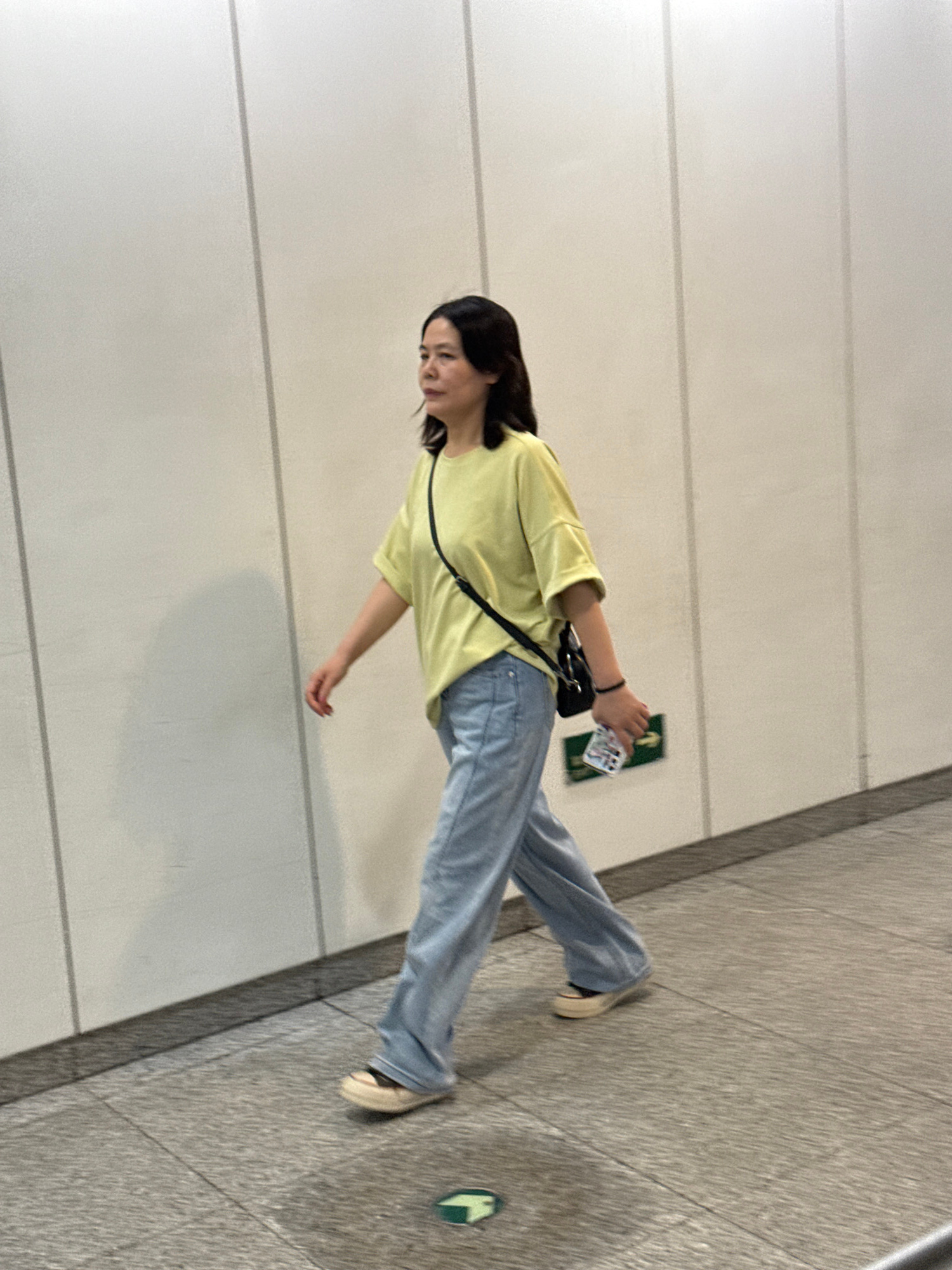 The image, taken in what appears to be an indoor public space, captures a young woman in motion. She has long, dark hair and is wearing a light yellow short-sleeved t-shirt, light blue loose-fitting j…read more