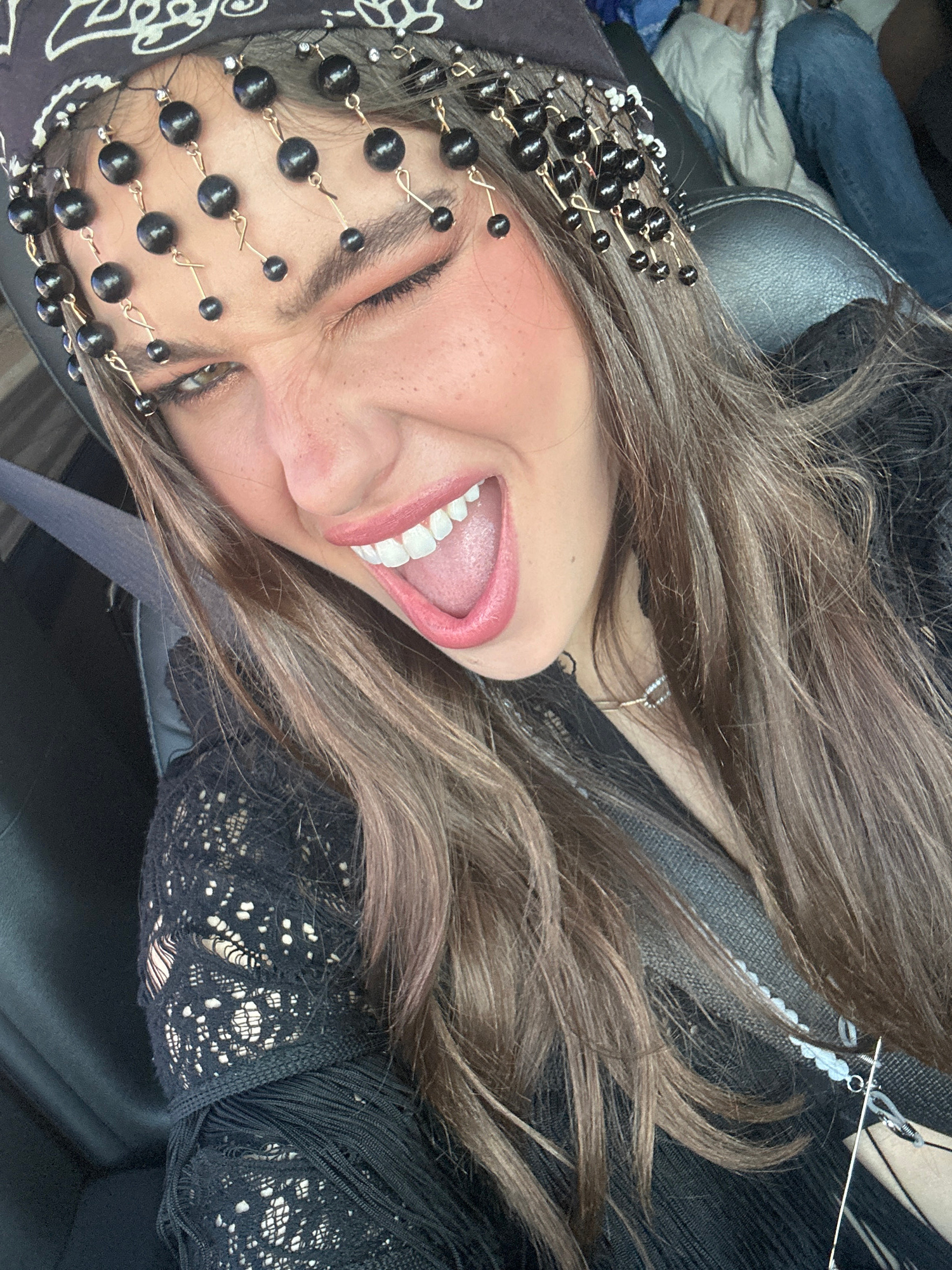 A woman is seen at an unusual angle, possibly lying down in a vehicle. She has fair skin, light brown hair, and is wearing a decorative headpiece of black beads. She has her mouth open, displaying her…read more