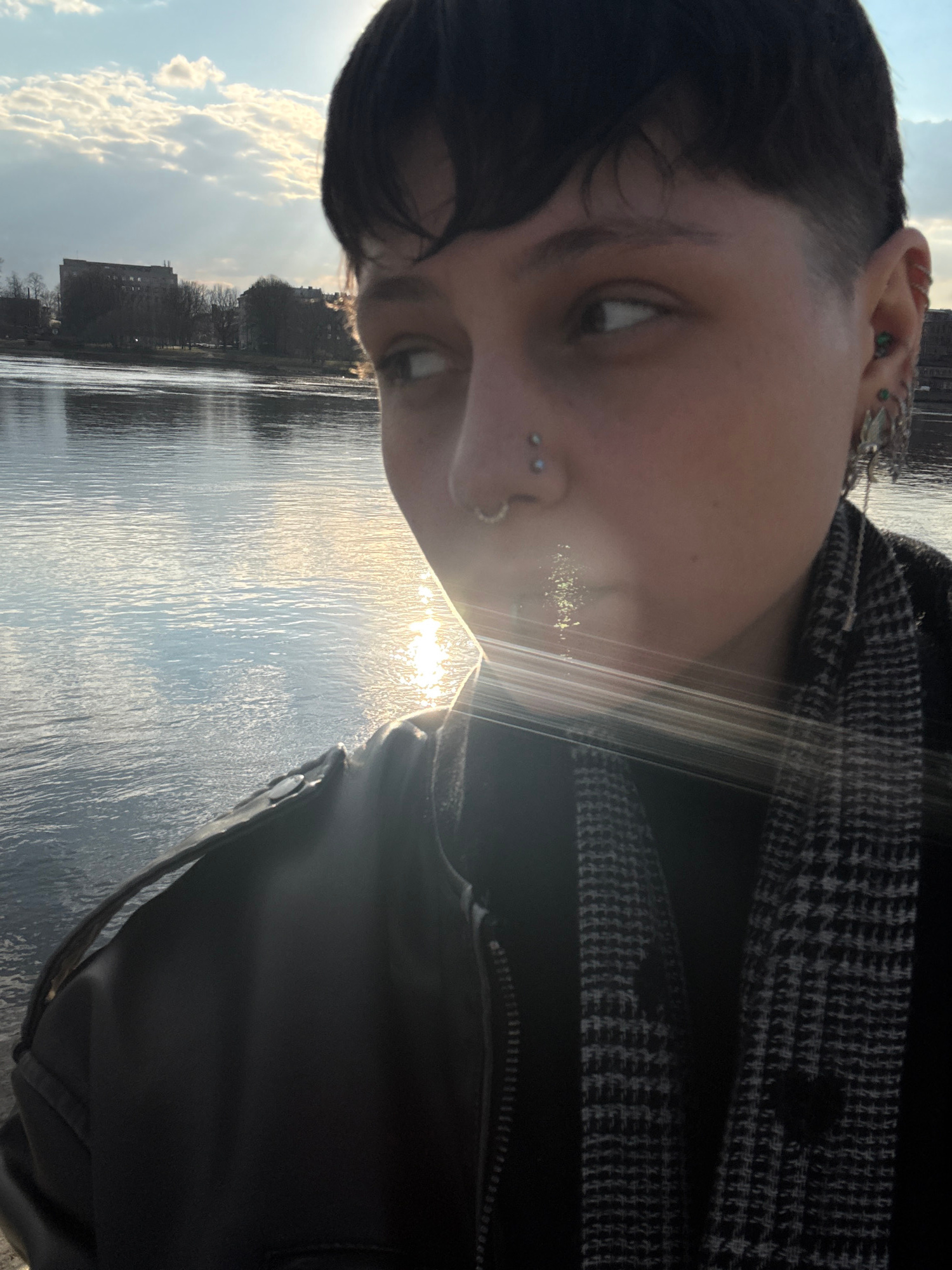A low-angle, slightly rotated, close-up shot features a person in the foreground with a river and buildings visible in the background. The person, likely female, has dark hair with a short, shaved sec…read more