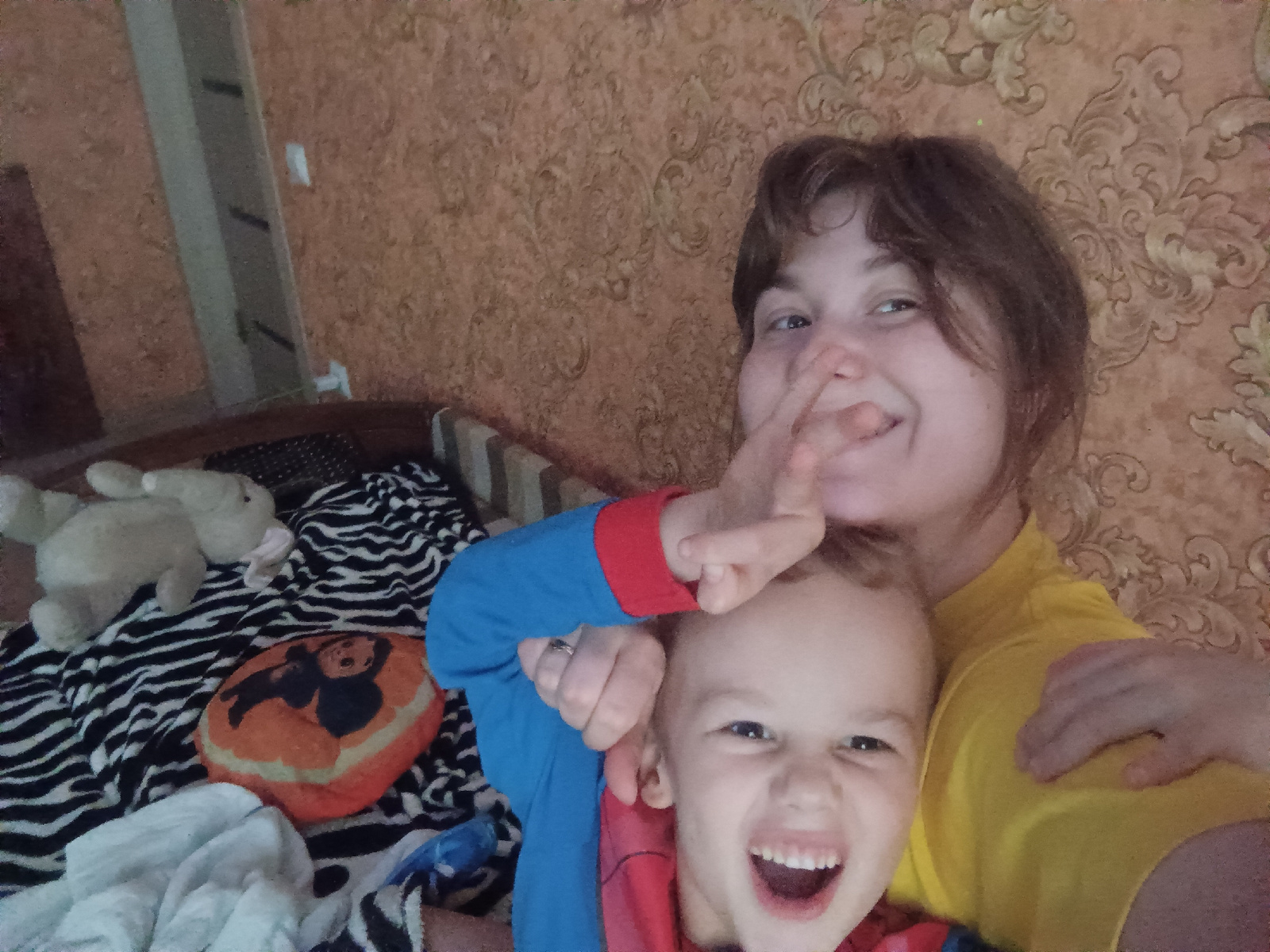 A woman and a child are in a room with patterned wallpaper. The woman, wearing a yellow shirt, is smiling and holding up two fingers. The child, wearing a blue and red shirt, is smiling widely. A stufβ¦read more