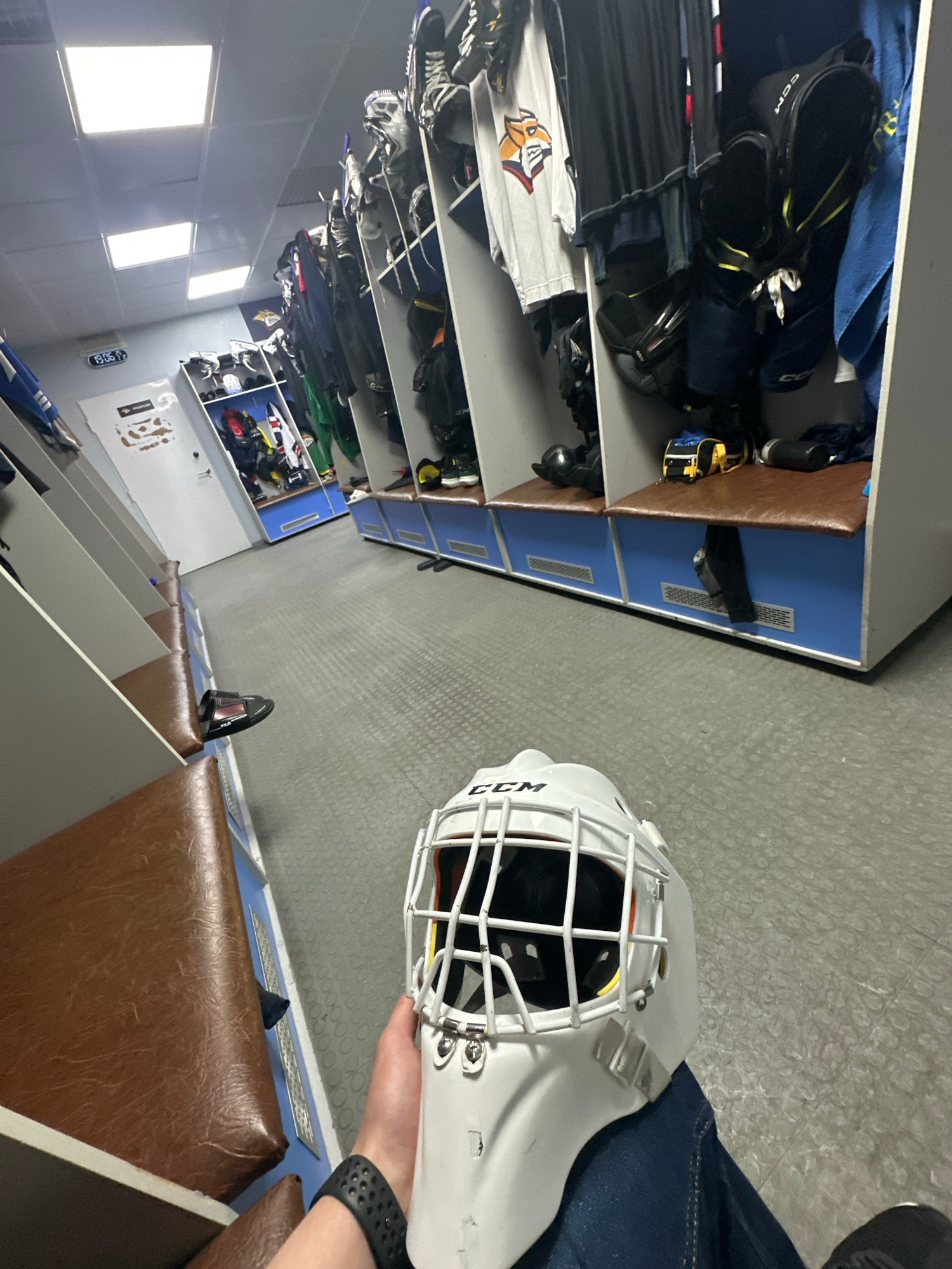 The image captures a hockey locker room scene, viewed from a slightly tilted, low angle, suggesting a first-person perspective. In the immediate foreground, a person's arm and hand are visible, holdin…read more
