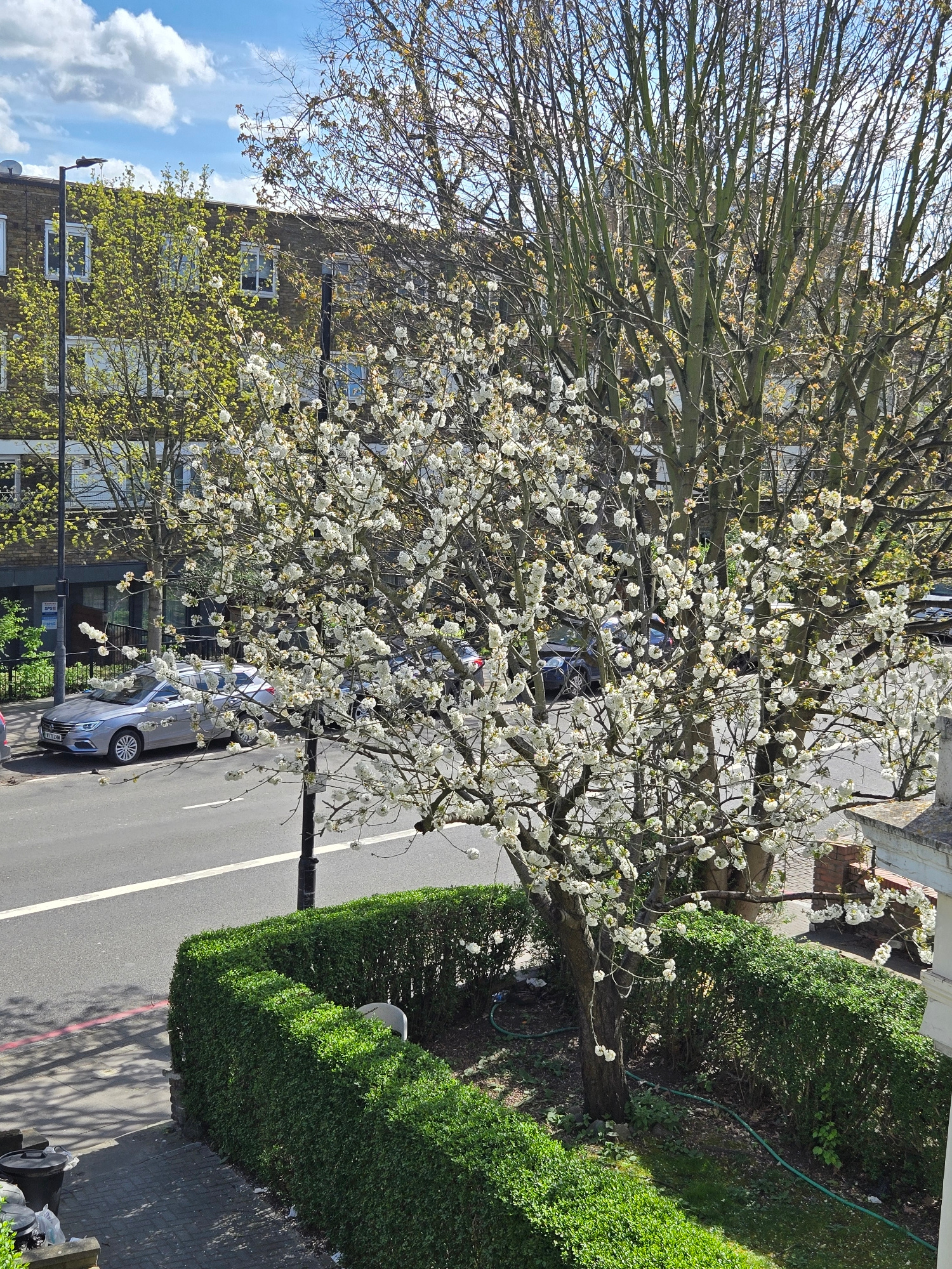 This is a high-angle, daytime photograph of a street in London, United Kingdom. The focus is on a tree in full bloom with white blossoms, positioned between a tall, green hedge and a row of terraced h…read more