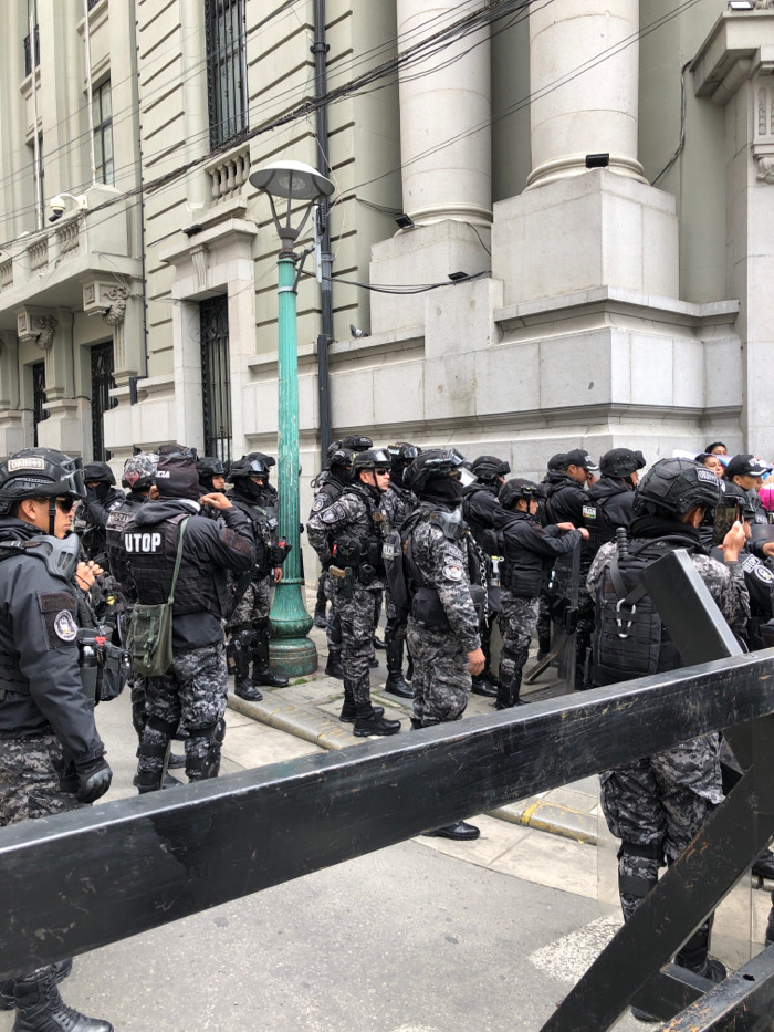A line of police officers, clad in dark tactical gear with camouflage patterns, stands at rest on a sidewalk next to a building with classical architectural details. They wear helmets and body armor,…read more