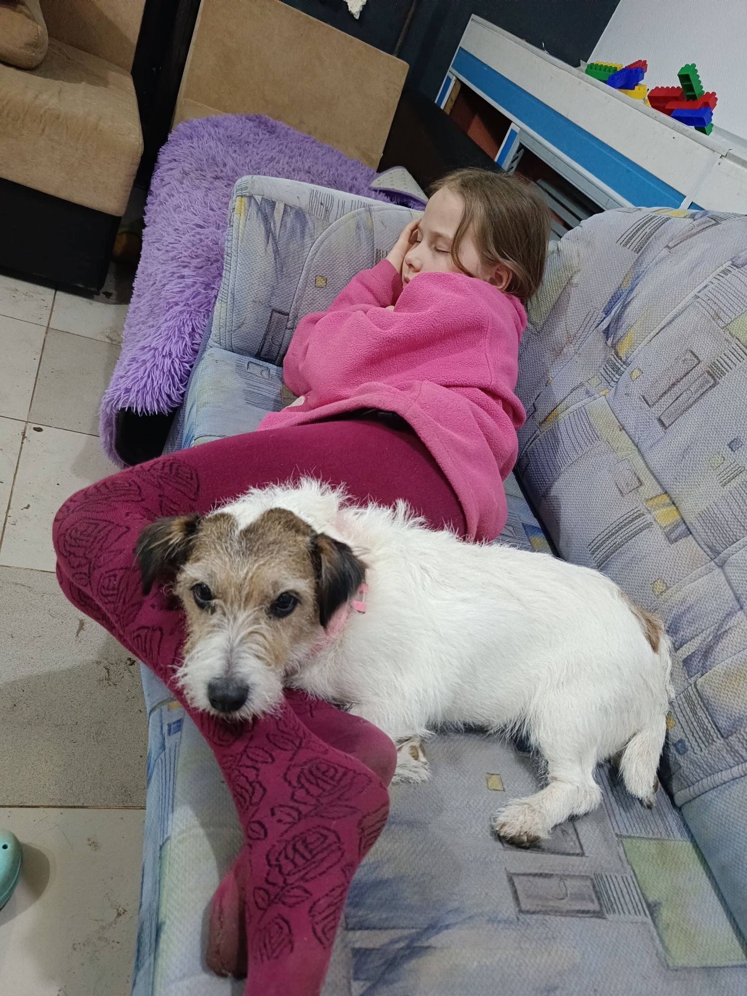 A young girl is asleep on a sofa, with a Jack Russell Terrier dog lying on her legs. The girl is wearing a pink fleece jacket and maroon leggings patterned with roses. The dog is white with brown markβ¦read more