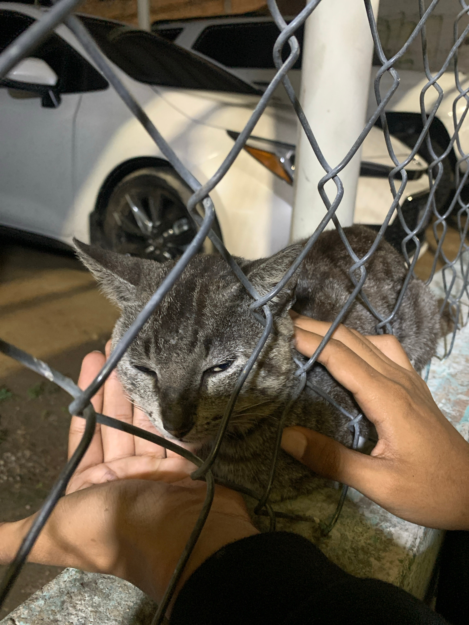 A medium shot depicts a gray tabby cat behind a wire fence, being petted by a person whose hands are visible. The cat's face is angled towards the right, with one eye visible. A hand reaches through t…read more