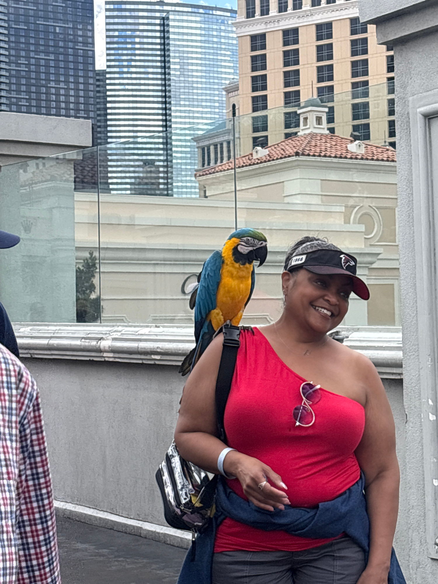 A medium shot depicts a smiling African American woman with a parrot perched on her shoulder, taken outdoors. The woman is wearing a red, off-the-shoulder top, a dark visor with the letter “A,” and ca…read more