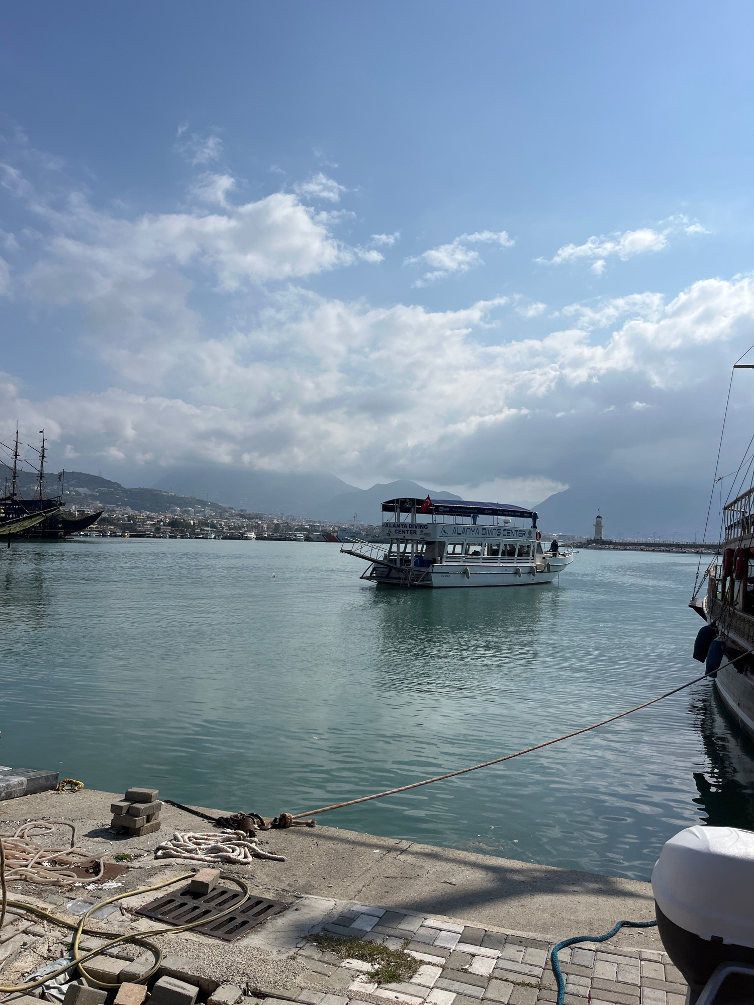 The image depicts a harbor scene in Alanya, Turkey, under a partly cloudy blue sky. The foreground shows a concrete pier with light grey paving stones. On the pier, various maritime objects are presen…read more