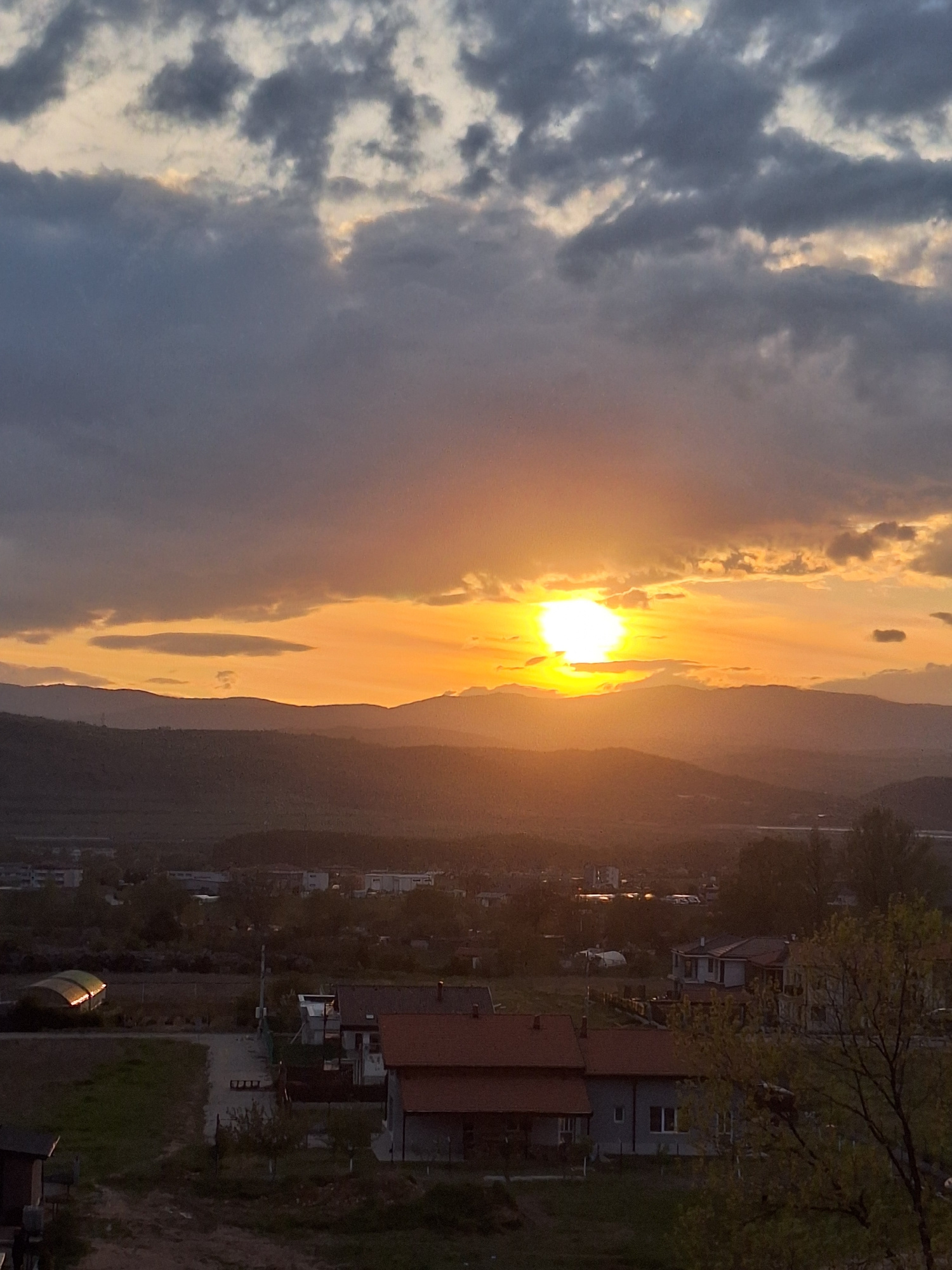 The image presents a dramatic sunset or sunrise over a mountainous landscape, likely in the Blagoevgrad region of Bulgaria, given the provided context. The sun, a brilliant and intensely bright orb, i…read more