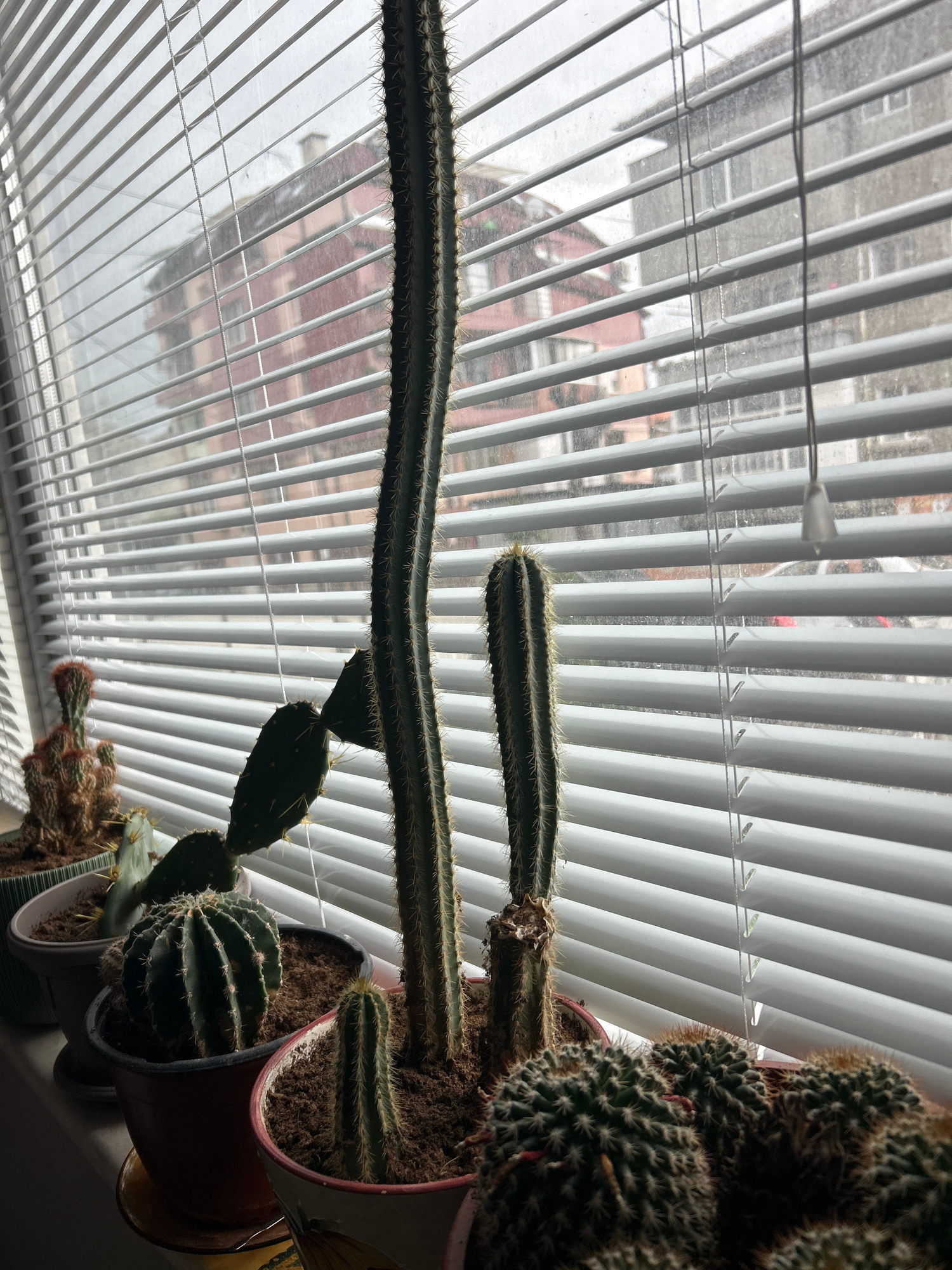 The image shows a collection of potted cacti arranged near a window with white Venetian blinds. Outside the window, a blurred view of buildings, possibly residential, can be seen. The cacti vary in sh…read more