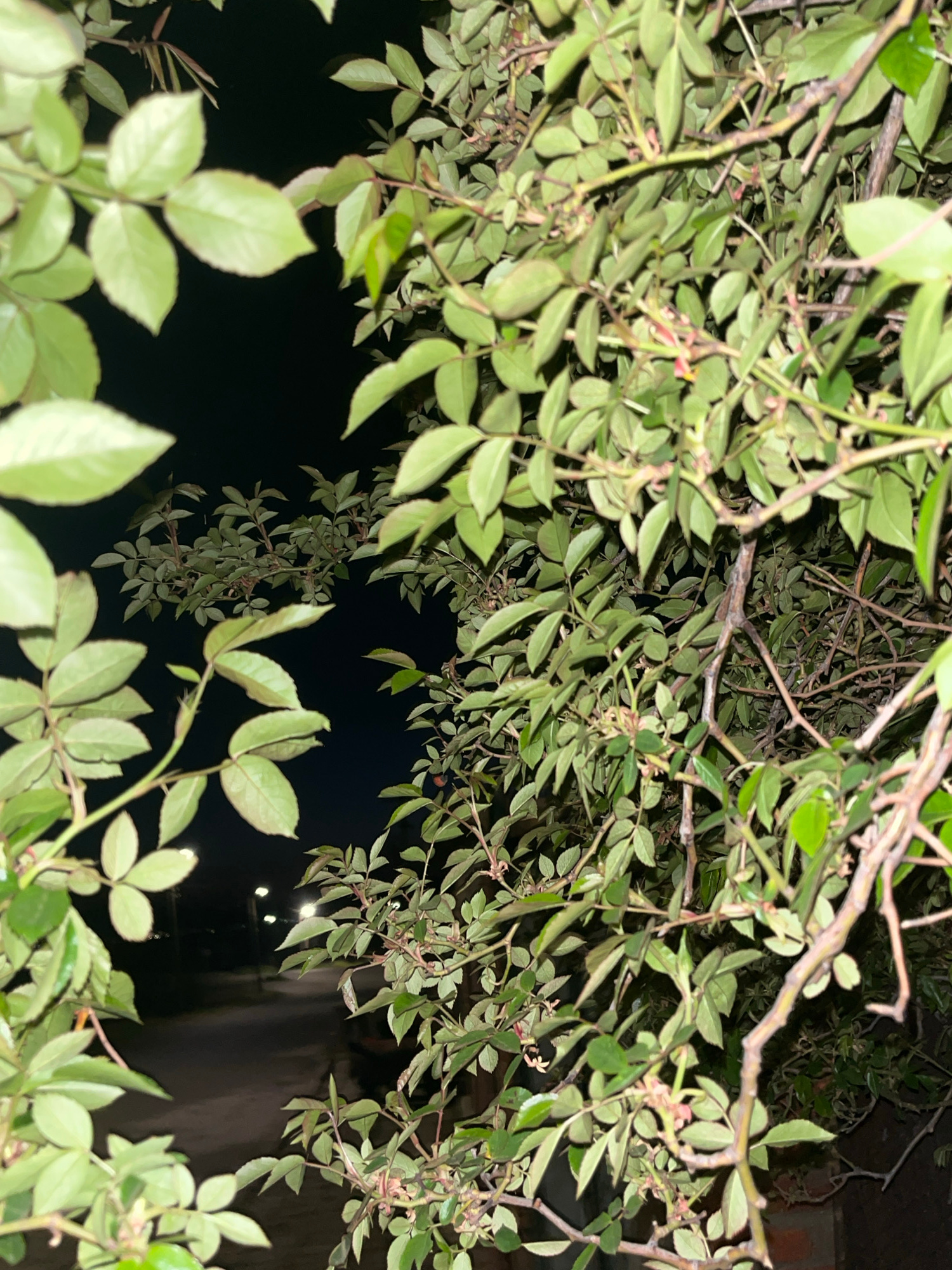 The image shows green leaves and branches in the foreground. In the background, there is a dark area, possibly indicating night or shadow. There are also some dim lights visible in the background thro…read more