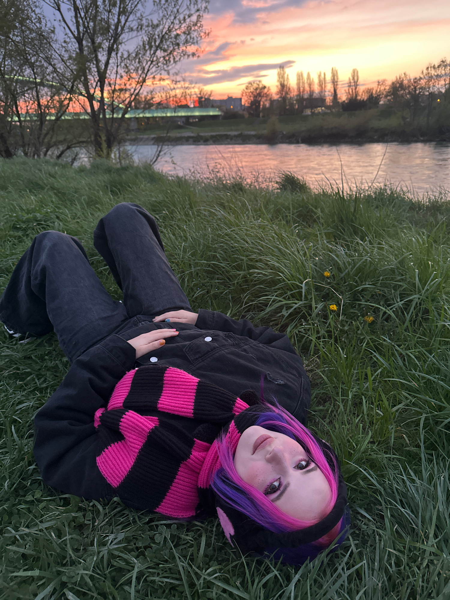 The image captures a scene outdoors, possibly in a park near a river or body of water, judging by the presence of lush green grass and a landscape mirroring the colors of the sunset in the water. The…read more