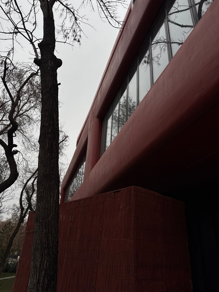 The image displays a low-angle perspective of the Armenian State Puppet Theatre on Sayat-Nova Avenue in Yerevan, Armenia. The prominent structure is a modernist building characterized by its reddish-b…read more