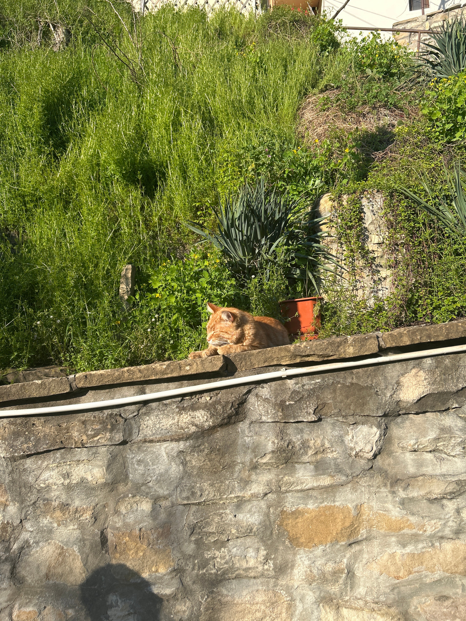 The image captures a scene in Veliko Tarnovo, Bulgaria. A ginger cat is perched on a low stone wall, looking down into a garden area filled with lush green grass and various plants. A terracotta pot s…read more