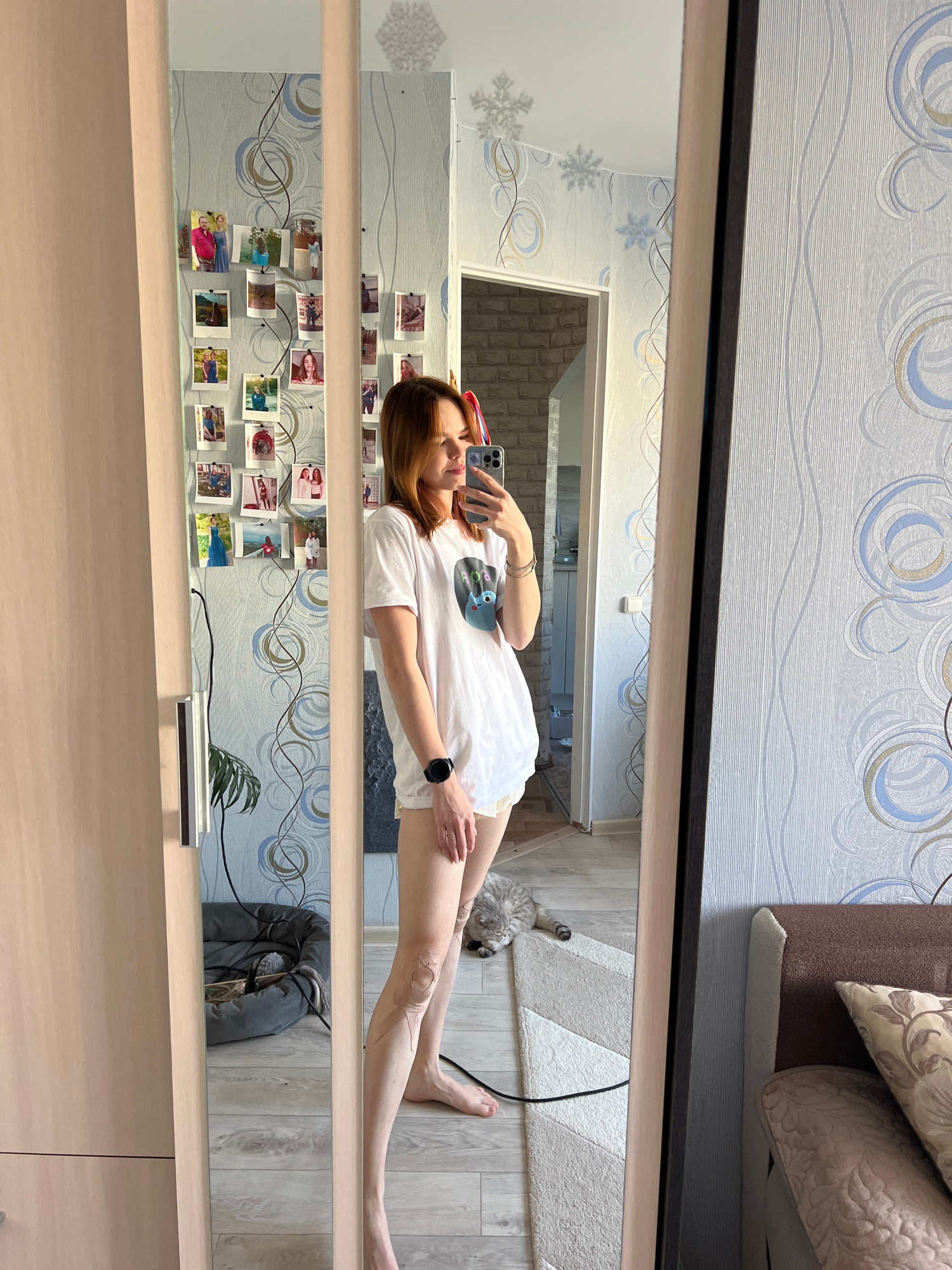 A reflection in a mirror shows a slender, light-skinned woman with auburn hair lying on her side, holding a phone to take a picture of herself. She is wearing a white t-shirt and light-colored shorts.…read more