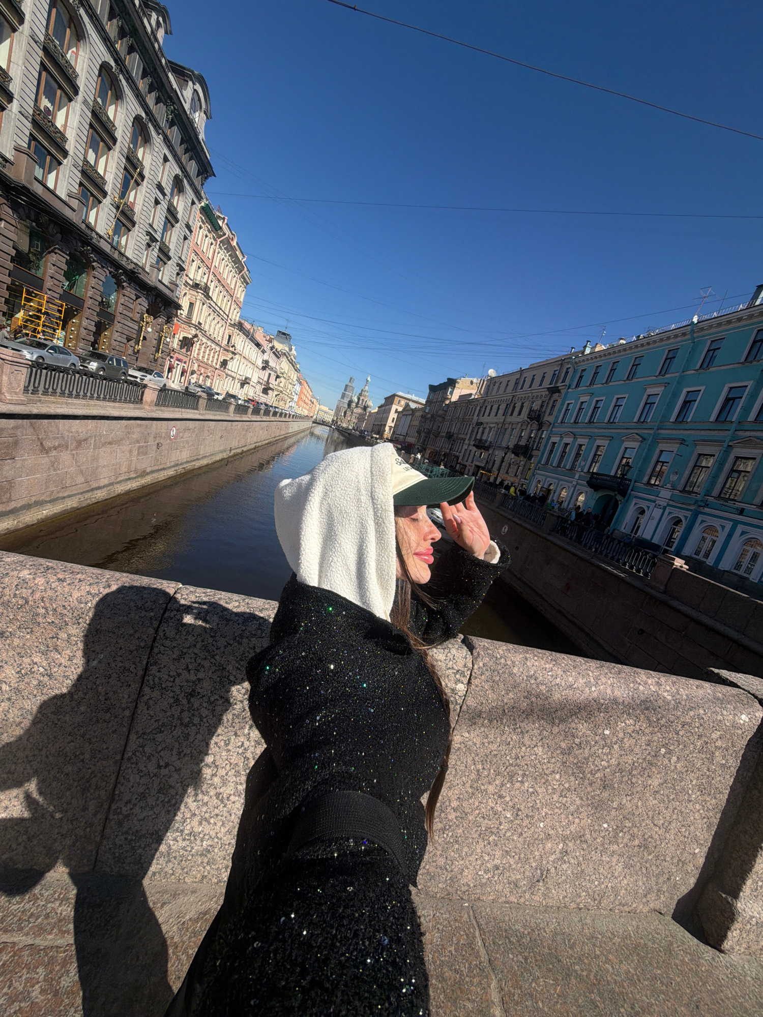 A person is captured in a selfie on a bright, sunny day in Saint Petersburg, Russia, overlooking a canal lined with historic architecture. The image shows the upper torso of a person, likely female, i…read more