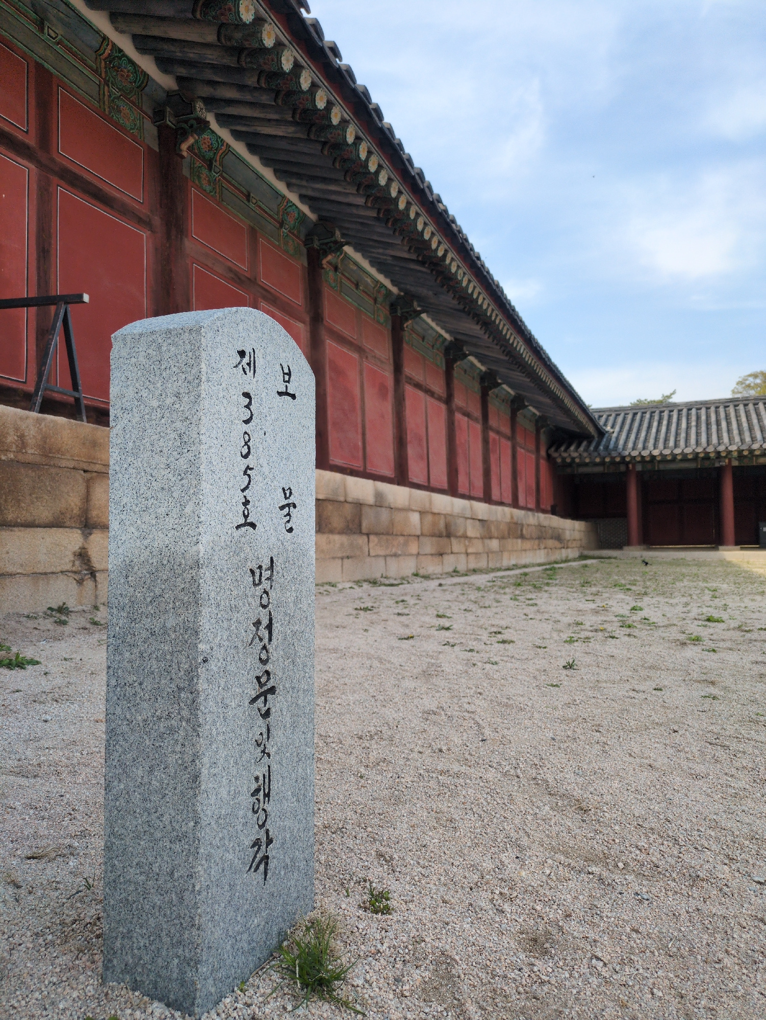 The image depicts a low-angle, side view of a stone marker in Seoul, South Korea. The marker, light gray with dark writing, sits at the edge of a gravel pathway. Behind the marker is the red and brown…read more