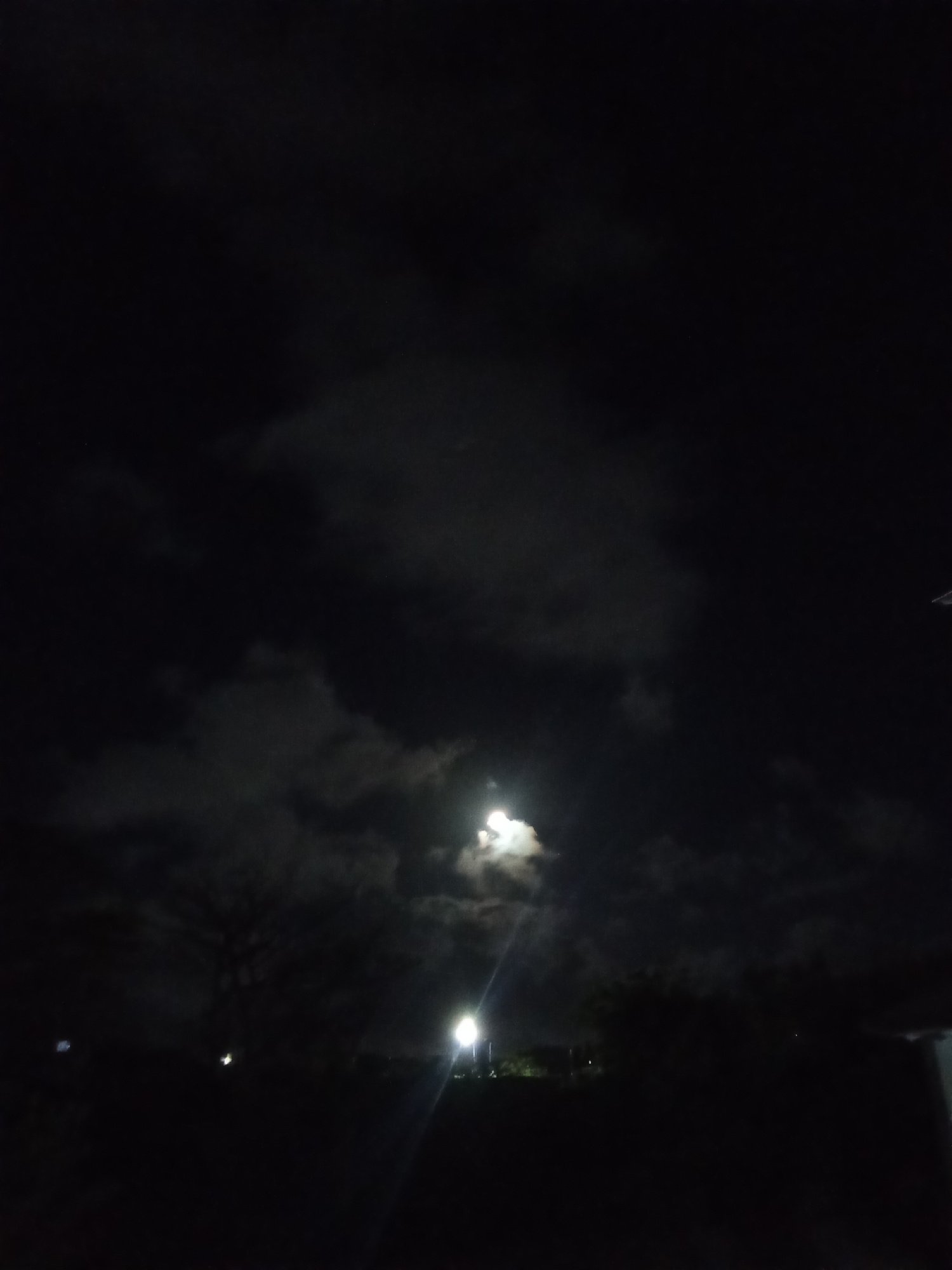 A nighttime scene in Juan Griego, Venezuela, shows a dark sky with scattered clouds partially obscuring the moon. The horizon line is barely discernible, with silhouettes of trees and vegetation. A br…read more