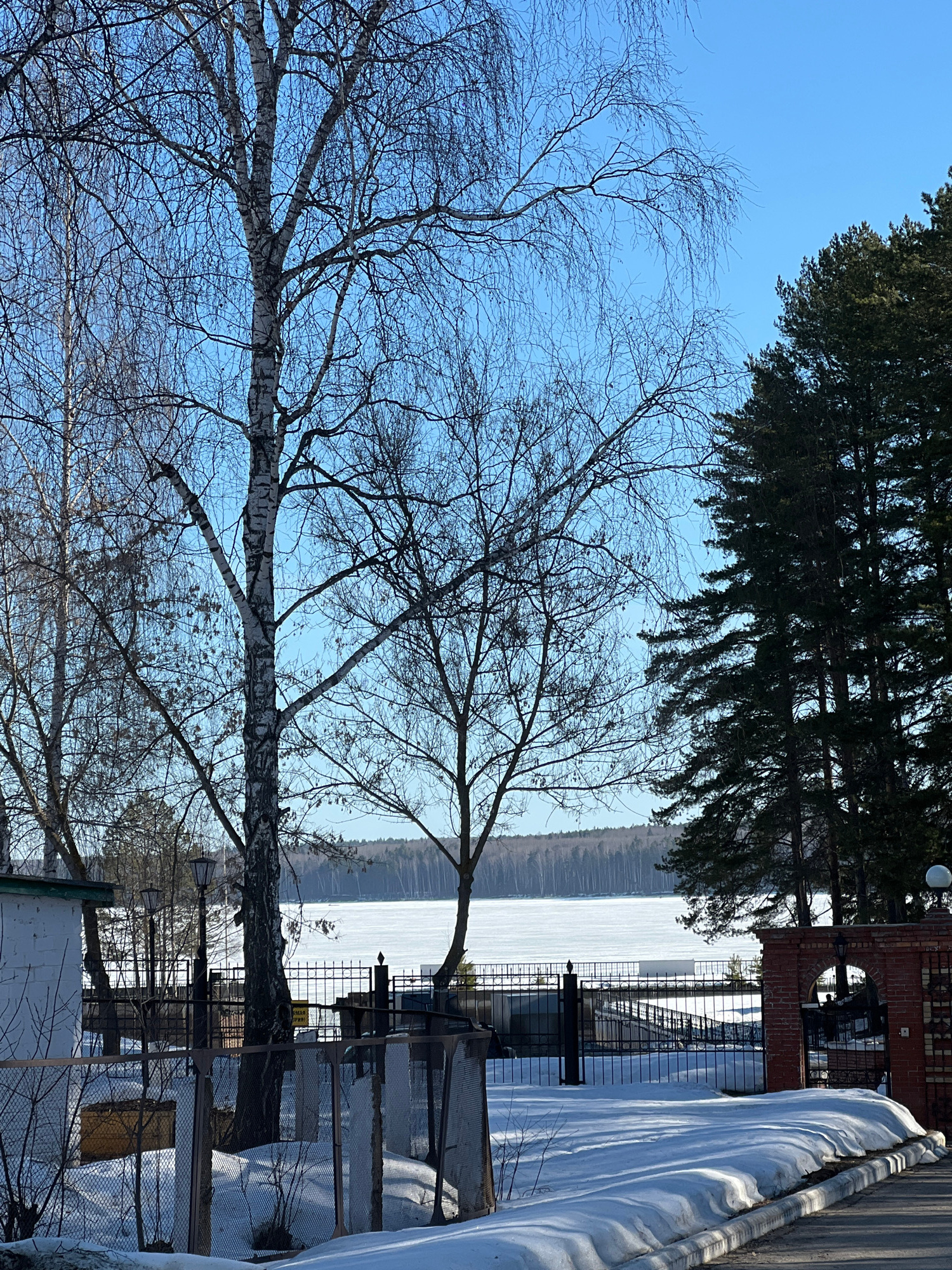 The image shows a winter landscape in Chaikovsky, Russia. In the foreground, there are two birch trees with bare branches against a clear blue sky. Behind the trees, there is a frozen lake or river. A…read more