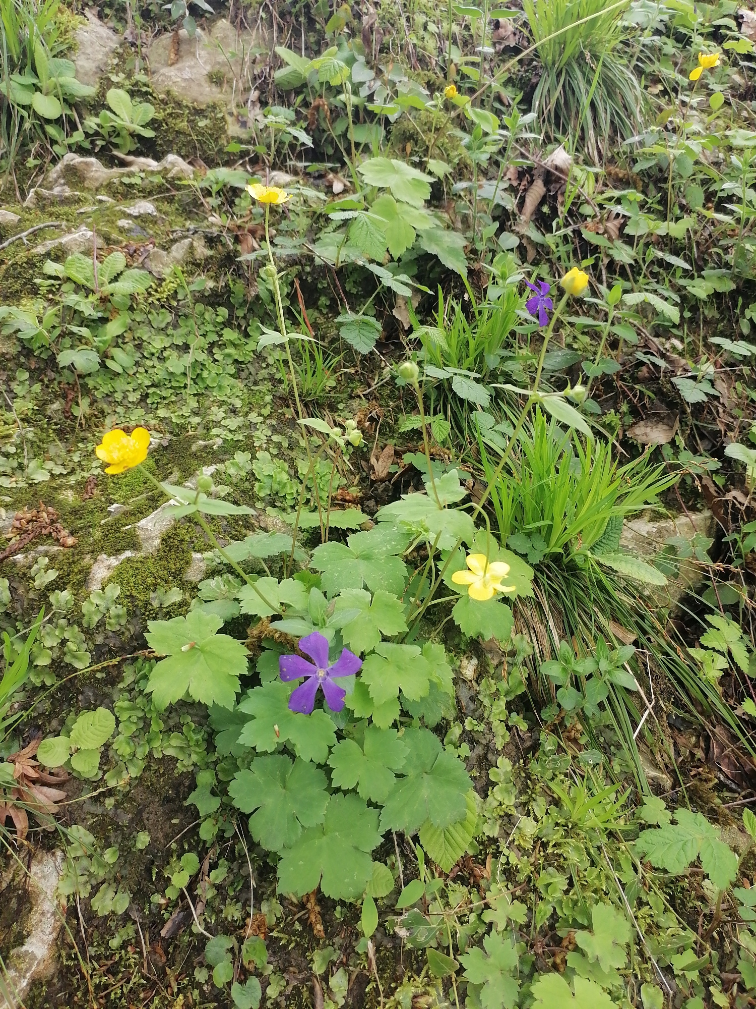 This media file presents a vibrant, natural close-up scene dominated by diverse flora and earthy elements. The primary subjects are various green plants and colorful flowers thriving on what appears t…read more