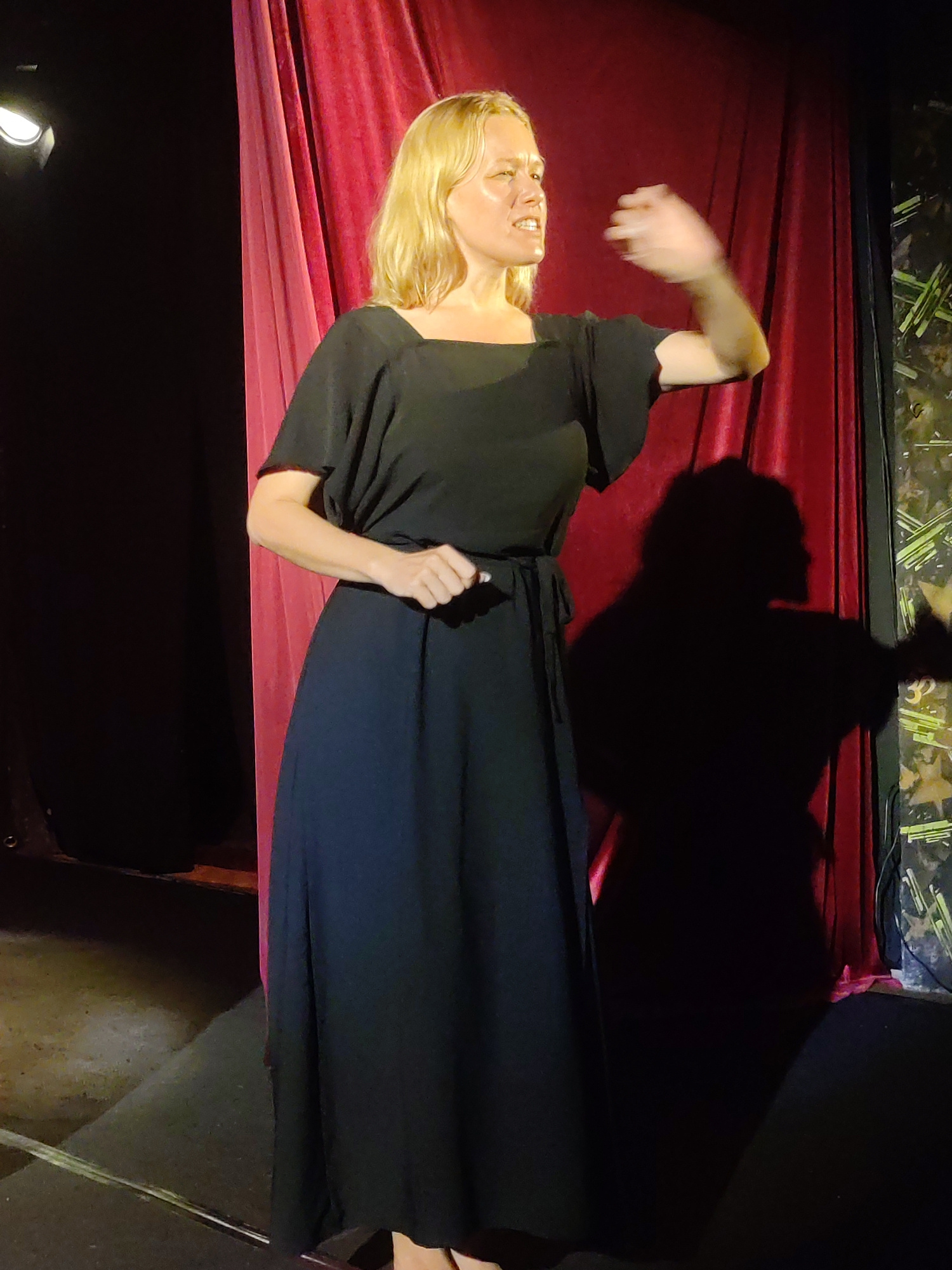 A blonde woman in a black dress stands on a stage in Bedulu, Indonesia, near a red curtain. She is gesticulating with her right hand, and a shadow falls behind her on a patterned wall. A stage light i…read more