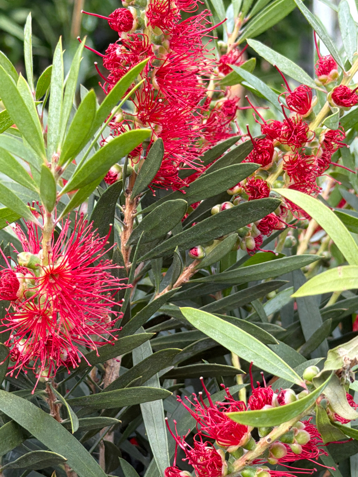 The image shows a close-up of a Bottlebrush plant (Callistemon), characterized by its vibrant red, brush-like flowers and narrow, green leaves. The flowers are in various stages of bloom, some fully o…read more