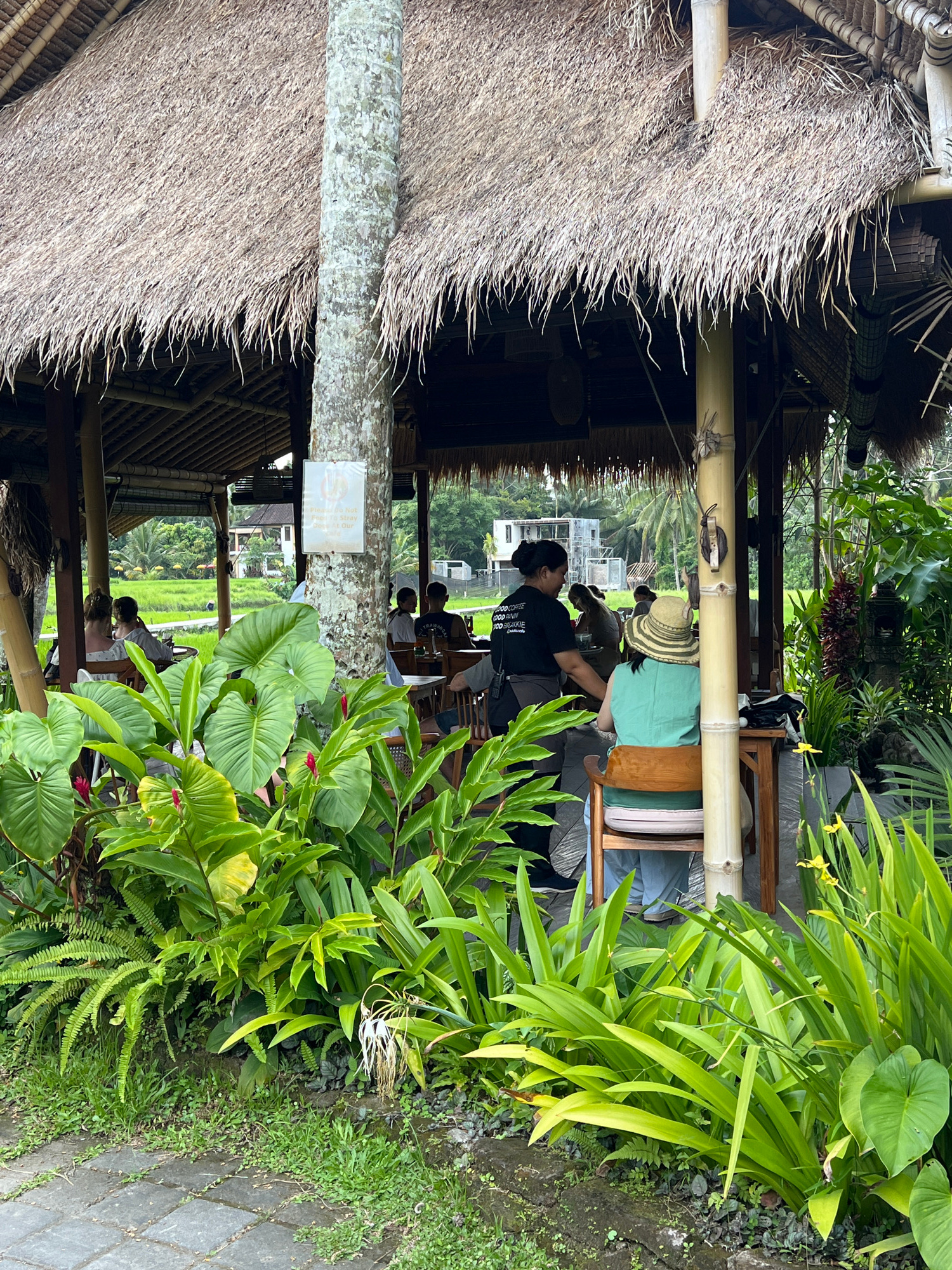 The image shows the interior and exterior of a structure with a thatched roof, presumably a cafe or restaurant, located in Ubud, Indonesia. **People:** Several people are visible. One woman wearing a…read more