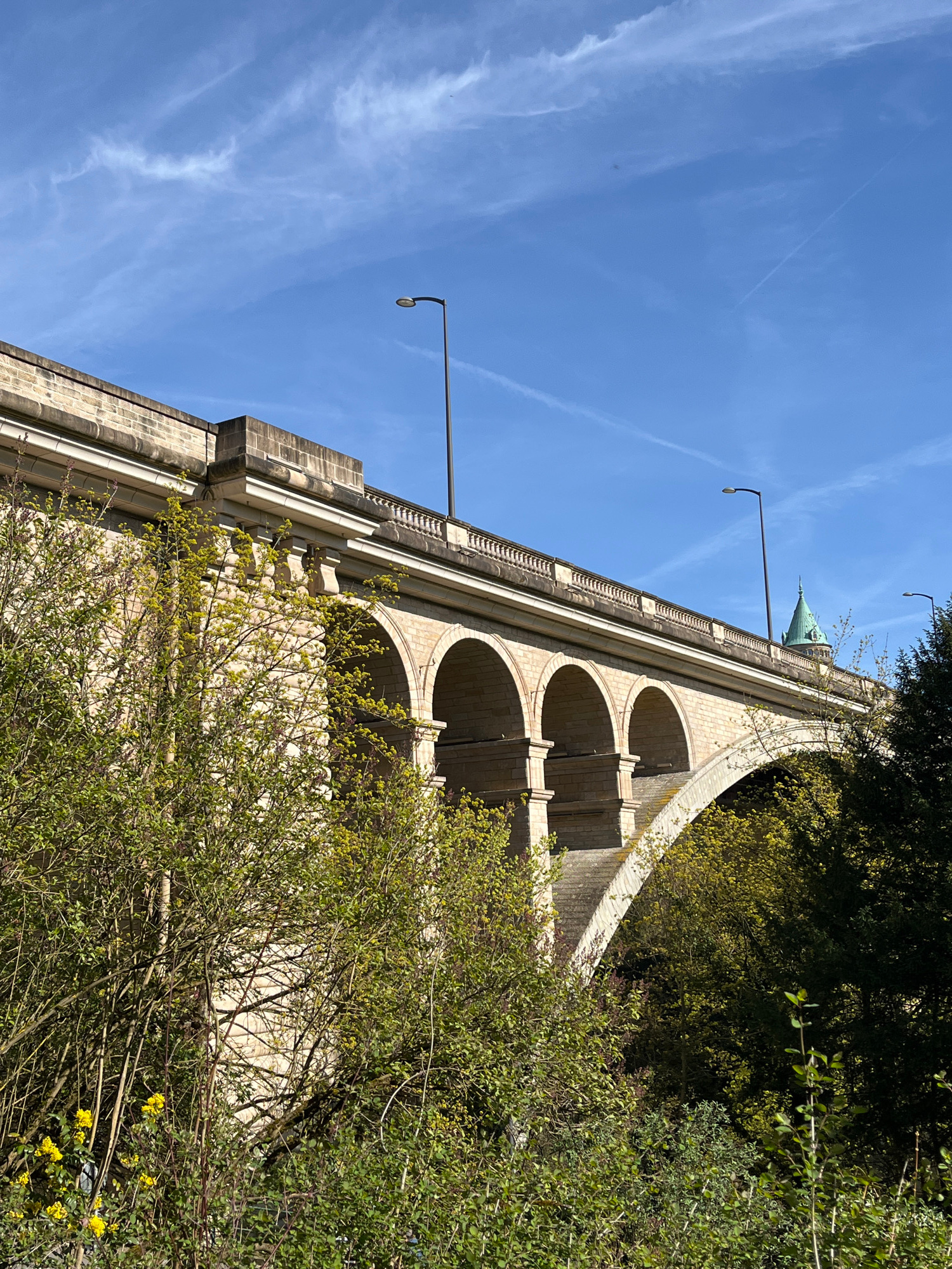 The image shows the Passerelle Viaduc in Luxembourg City, Luxembourg, viewed from a low angle. The viaduct, constructed of light-colored stone, features a series of arches supporting a walkway lined w…read more