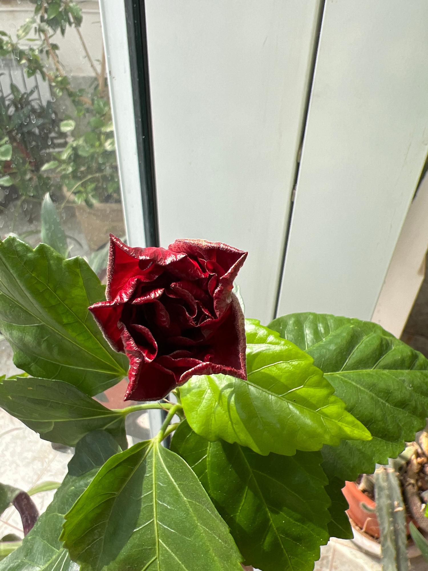 A vibrant, dark red flower bud, possibly a hibiscus, is prominently featured on the right side of the frame, partially opened to reveal its ruffled petals. The bud is surrounded by large, lush, bright…read more